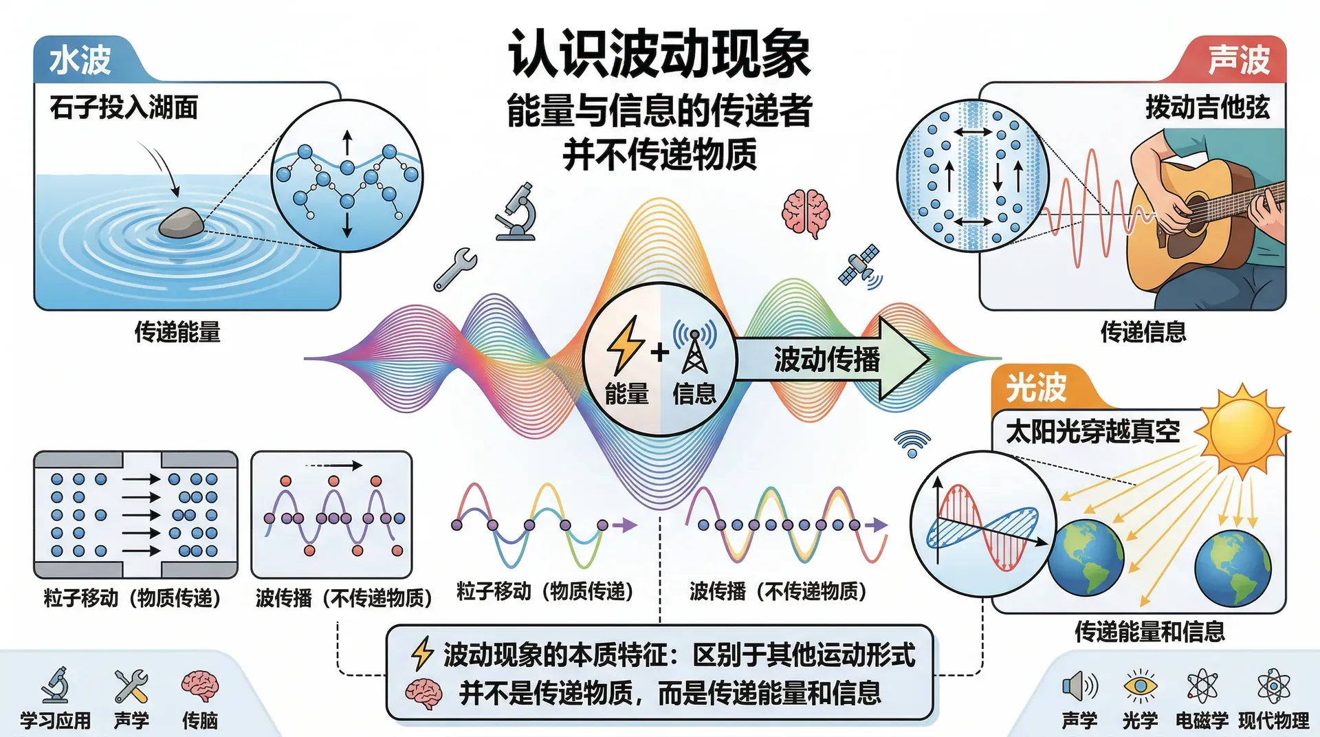 波是自然界中极为普遍的一种运动形式。湖面上投入一颗石子,涟漪向四周扩散;拨动吉他弦,声音传遍整个房间;太阳发出的光穿越亿万公里的真空抵达地球——这些现象看似不同,背后却遵循着共同的规律。波并不传递物质,而是传递能量和信息,这正是波动现象区别于其他运动形式的本质特征。