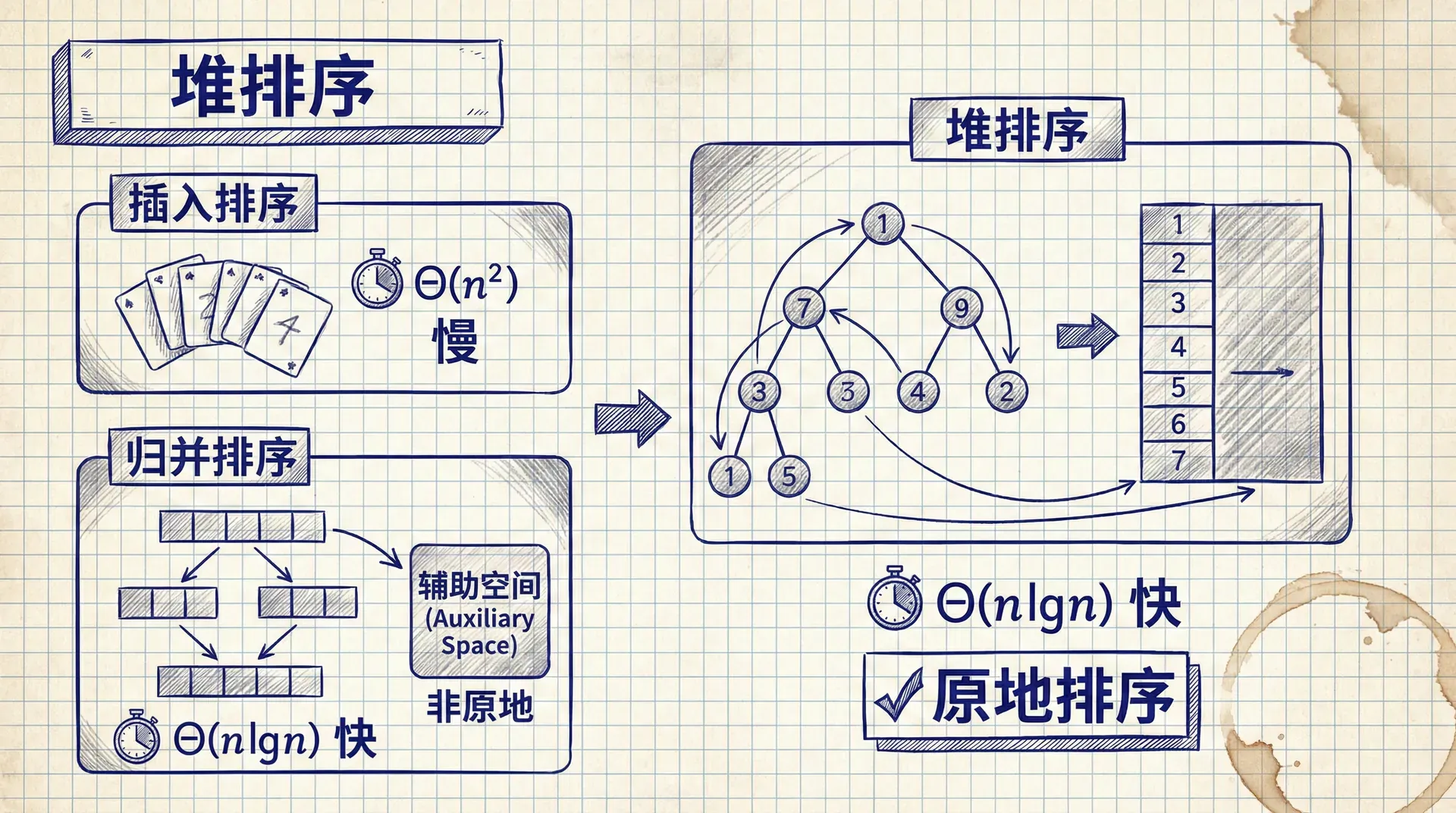 在前面的章节中,我们系统学习了插入排序和归并排序两种经典的排序算法。插入排序虽然实现简单直观,但其 的时间复杂度在面对大规模数据时效率低下。 归并排序以其 的渐近时间复杂度展现了优异的性能,然而它需要 的额外存储空间来完成合并操作,无法实现原地排序(in-place sorting)。