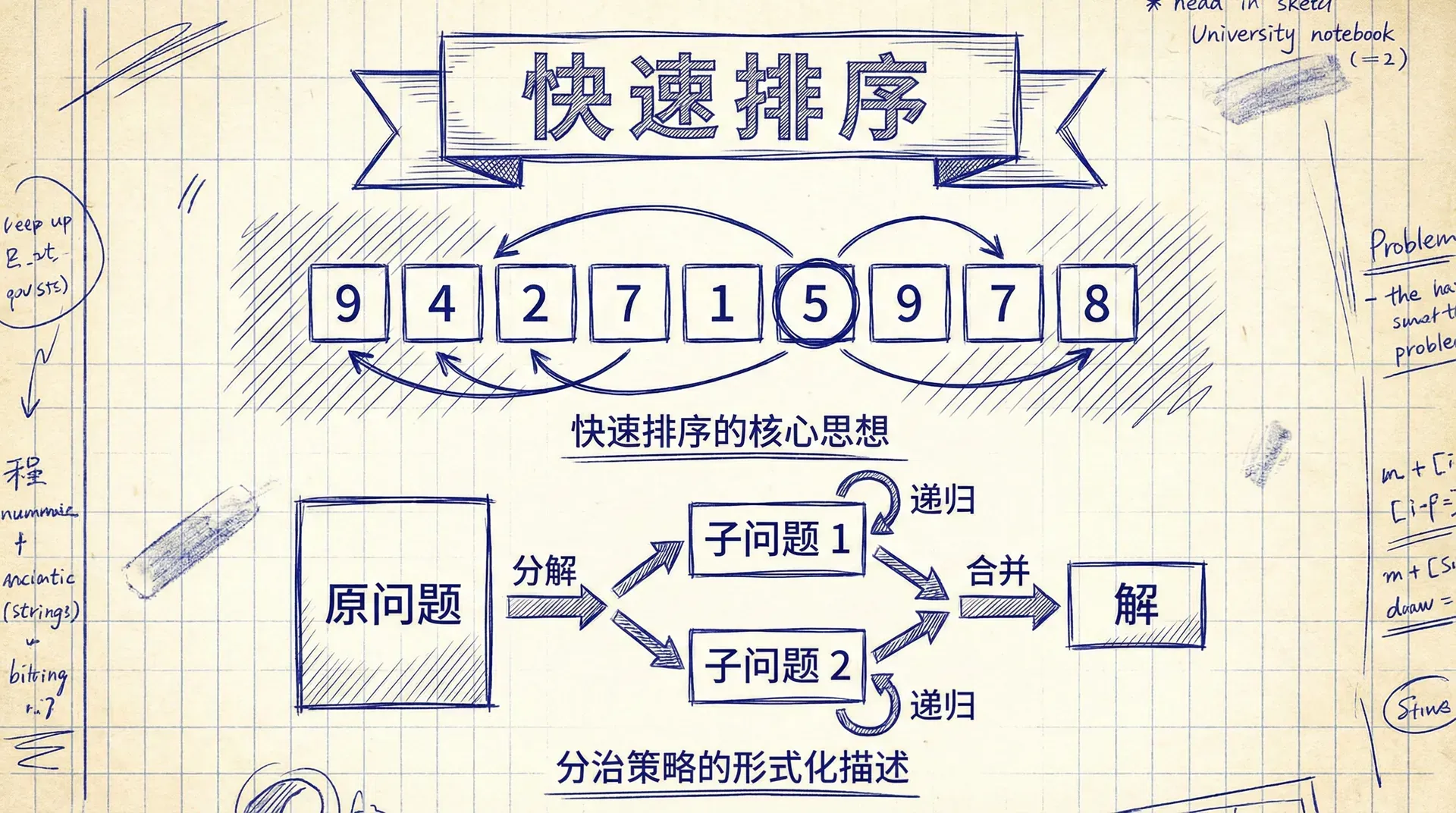 让我们从数学的角度来理解快速排序的分治过程。给定数组 ,快速排序的分治策略可以形式化地描述为: