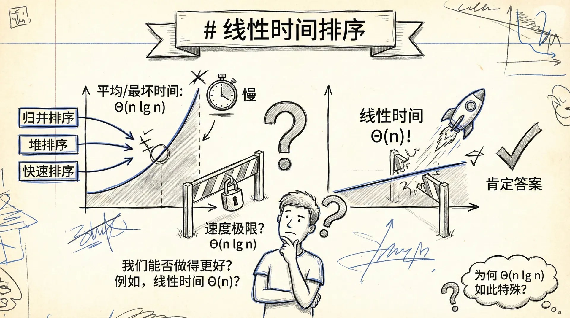 到目前为止,我们所学习的归并排序、堆排序和快速排序等算法,其最快的运行时间(无论是平均还是最坏情况)都达到了 。 这引出了一个深刻的问题:排序算法的速度极限就是 吗?我们能否做得更好,例如,在线性时间 内完成排序? 这里我们将给出肯定的答案。但在此之前,我们首先需要理解为何 如此特殊。