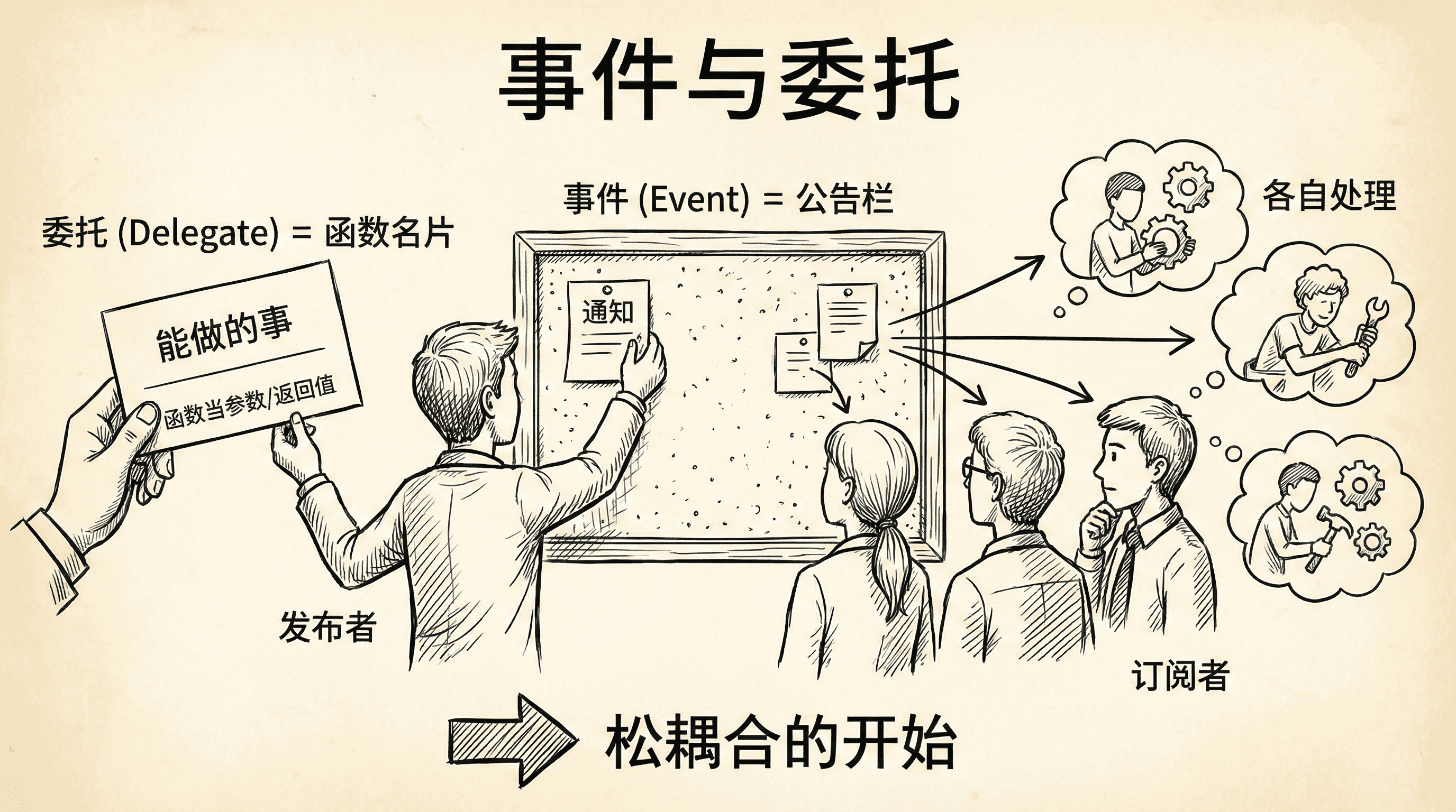 把委托想成“类型安全的函数名片”,把事件想成“公告栏”:发布者贴出通知,订阅者各自处理。——这就是松耦合的开始。