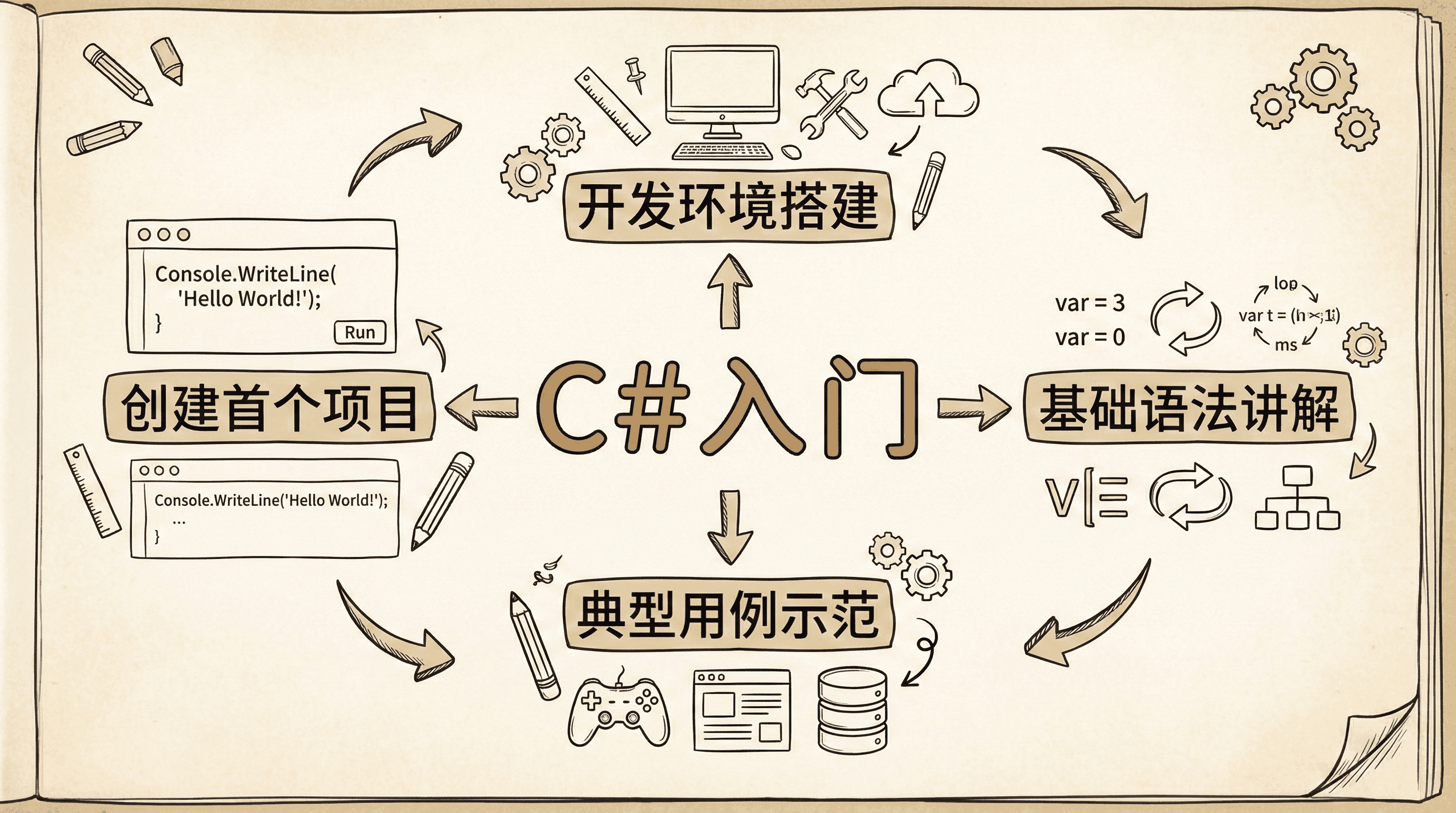 你会经常看到两个名字:C# 和 .NET。简单理解:C# 是语言,就像“中文”; .NET 是运行时和标准库,就像“字典+工具箱”。我们用 C# 说话,用 .NET 提供的工具去做事。