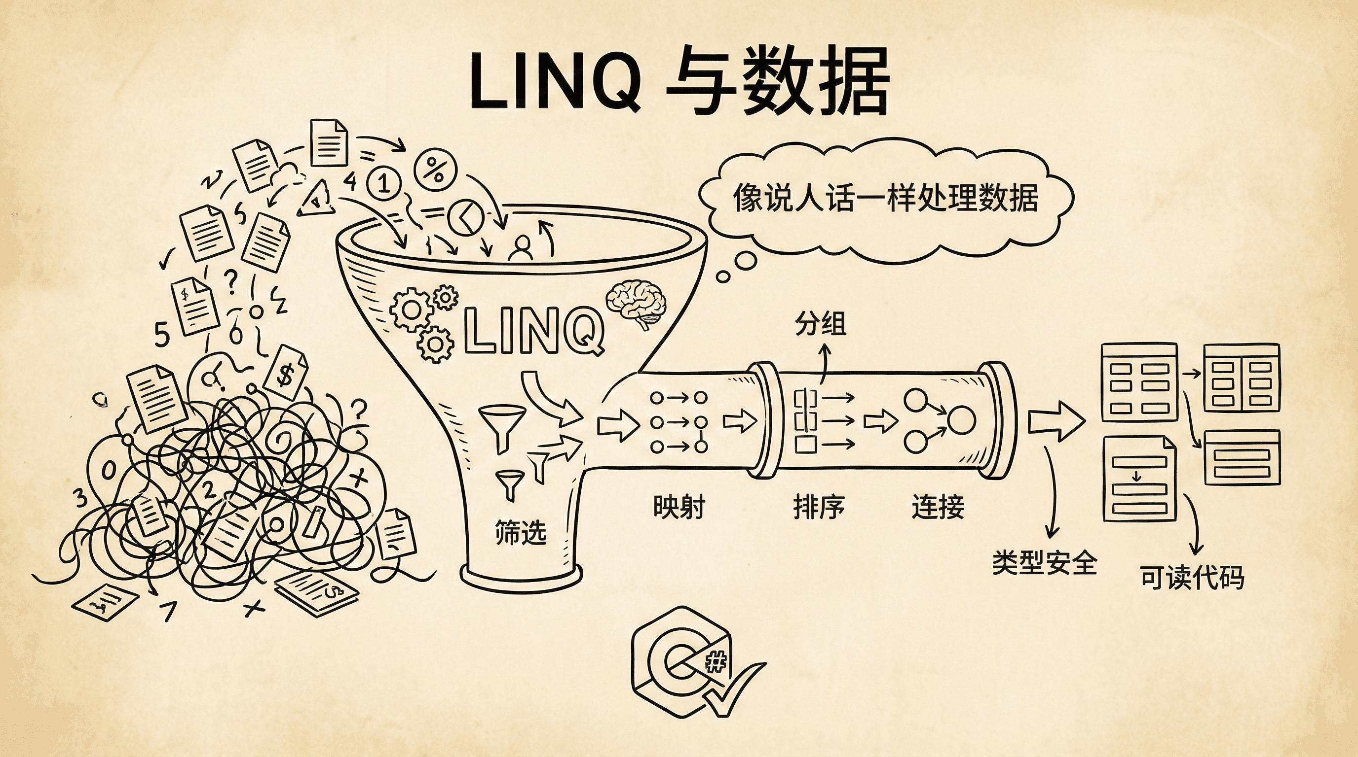 当数据越来越多,我们就会渴望一种“像说人话一样处理数据”的方式:筛选、映射、分组、排序、连接…… C# 给我们的答案是 LINQ(Language Integrated Query):把数据操作的语义“嵌入语言”,让我们在编译期就能得到类型安全与智能提示,同时保持代码可读、可组合、可测试。