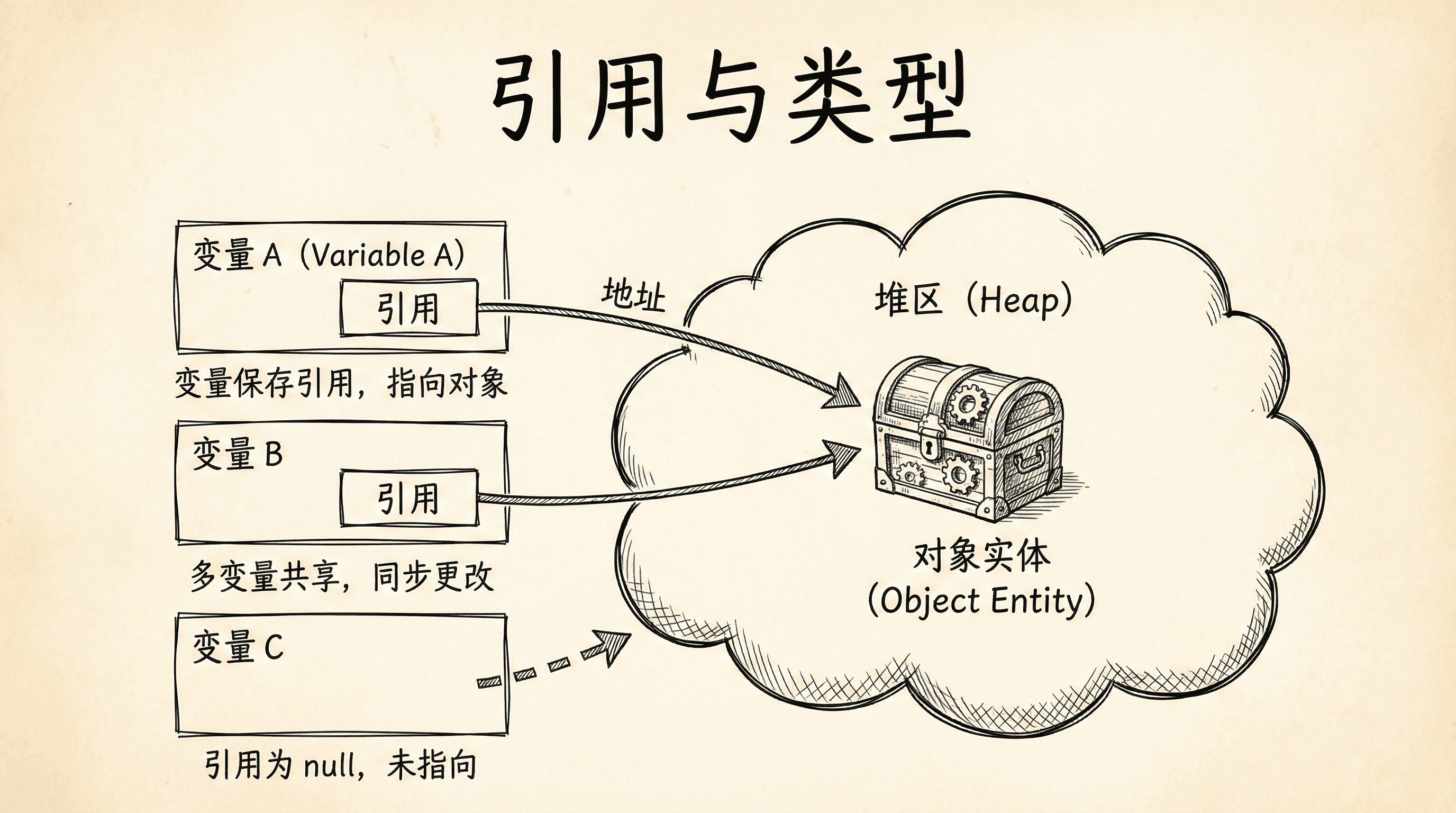 在计算机程序设计中,对象的存储与访问方式分为引用(Reference)与类型(Type)的概念。可以将对象理解为存储于内存(通常为堆区)中的实体,而变量本身则保存着该对象的引用或地址,即对象在内存中的定位信息。