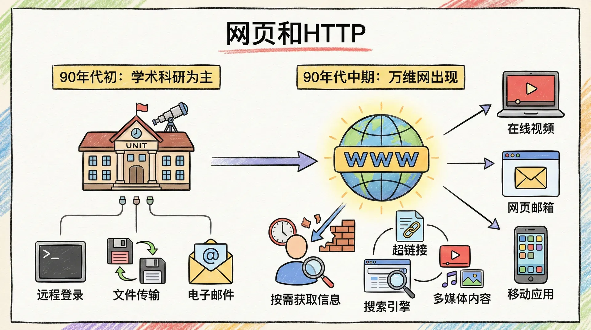 上世纪90年代初,互联网主要服务于学术和科研领域,应用场景以远程登录、文件传输和电子邮件为主。直到90年代中期,万维网的出现彻底改变了互联网的格局,使其成为全球最重要的信息平台,极大拓展了互联网的应用边界。