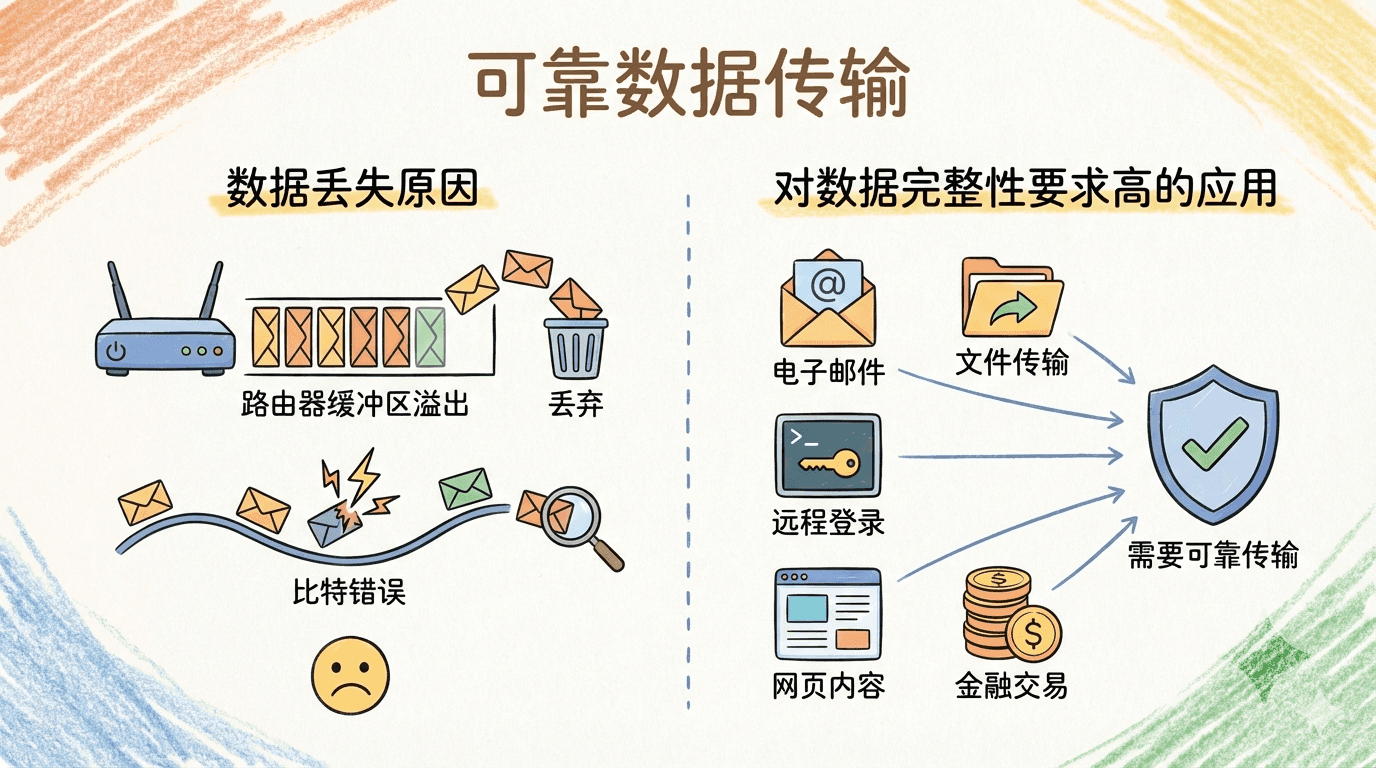 在计算机网络环境中,数据包在传输过程中存在丢失的风险。常见的丢失原因包括路由器缓冲区溢出导致的数据包丢弃,或数据在传输过程中发生比特错误而被主机或路由器判定为无效并丢弃。 对于诸如电子邮件、文件传输、远程登录、网页内容分发以及金融交易等对数据完整性要求极高的应用场景,任何数据丢失都可能带来严重后果,甚至影响业务的正常运行。