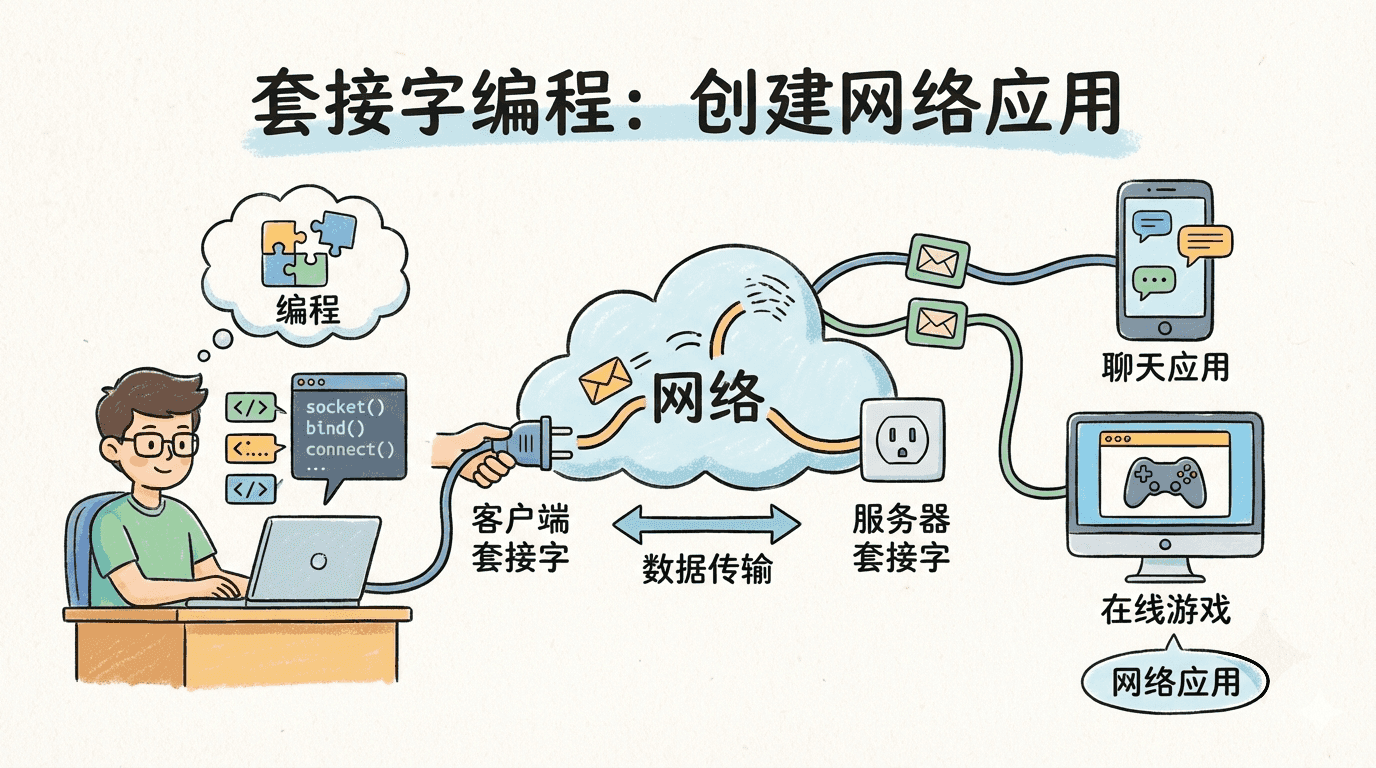 我们已经一起了解了各种经典的网络应用案例。接下来,让我们真正动手,看看如何亲自开发一个网络应用。还记得我们在之前聊过的内容吗?其实,绝大多数网络应用的本质,就是“客户端”和“服务器”这两个程序,分别运行在不同的终端设备上。 它们之间通过“套接字”这个桥梁,互相发送和接收数据。对于开发者来说,最核心的任务,就是把客户端和服务器的代码写出来,让它们能顺畅地沟通。