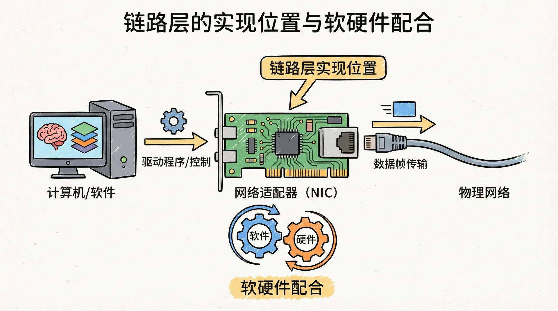 你可能会好奇,链路层的功能是在硬件中实现,还是在软件中实现?答案是两者的结合,而且大部分关键功能是在硬件中实现的。