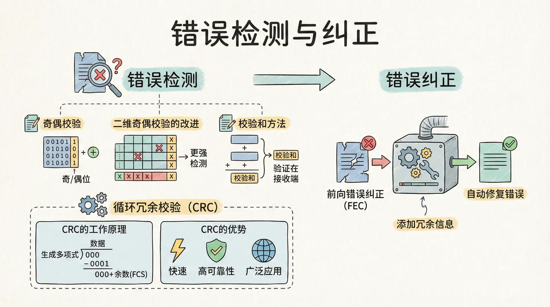 传输过程中的干扰可能导致数据位的翻转,链路层通常会在帧中加入一些额外的检错码来发现这些错误。更先进的技术甚至可以不仅检测错误,还能纠正错误。