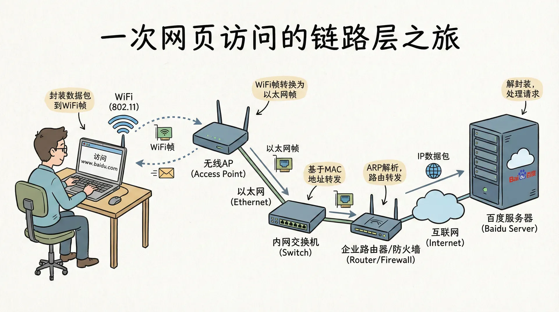 为了更系统地梳理链路层的核心原理,我们以一个典型的企业办公场景为例:设想在公司环境下,工程师使用笔记本电脑通过WiFi接入内网,