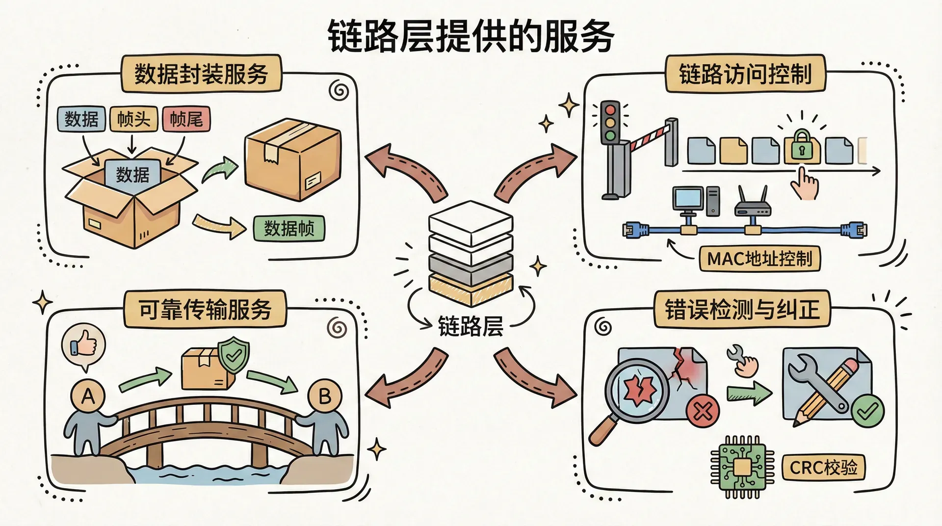 就像快递公司会提供不同等级的服务一样,不同的链路层协议也提供不同程度的服务保障。让我们来看看链路层可能提供的主要服务类型。