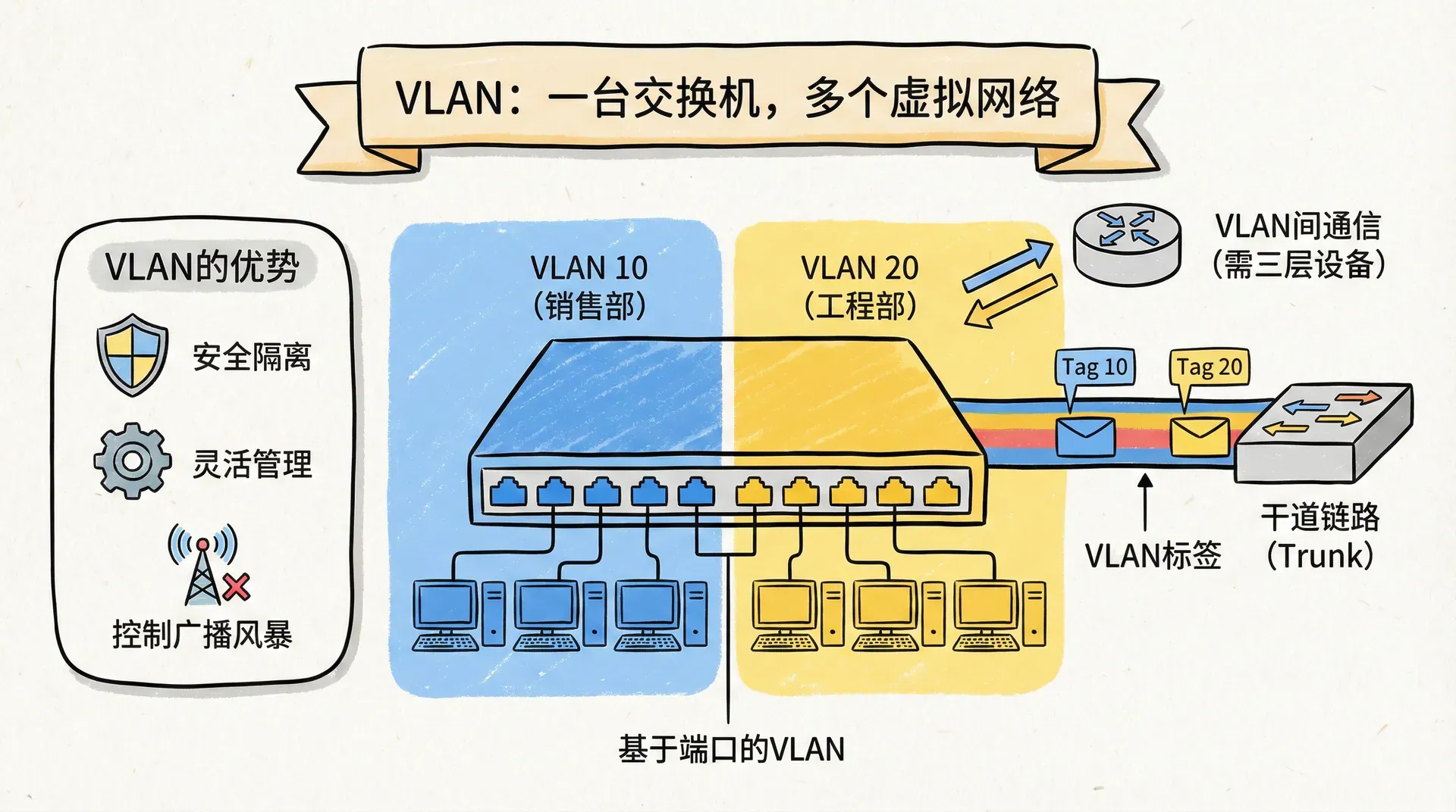 想象一个大公司有财务部、技术部和市场部三个部门。出于安全考虑,我们希望不同部门的网络流量相互隔离,但又不想为每个部门单独购买交换机。VLAN技术就能完美解决这个问题。