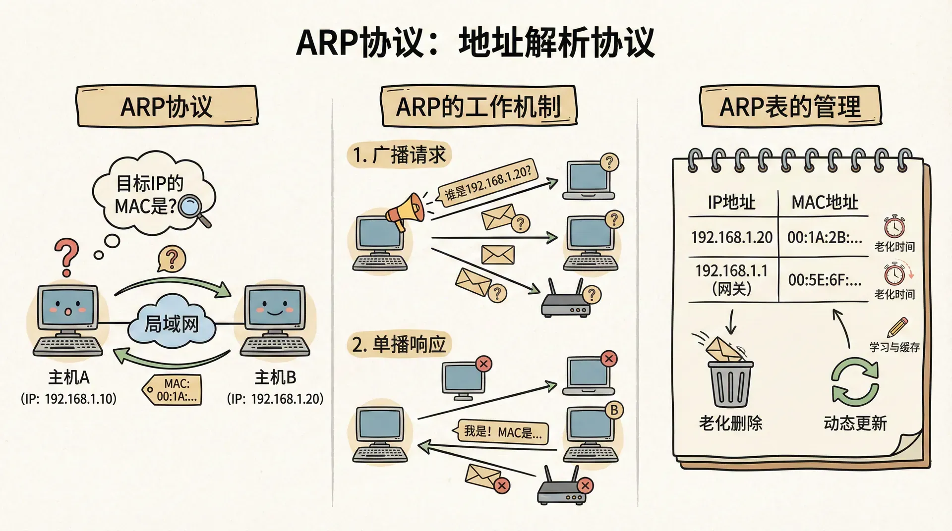 地址解析需求:主机A需要向主机B发送数据,但只知道B的IP地址(比如192.168.1.100),不知道对应的MAC地址