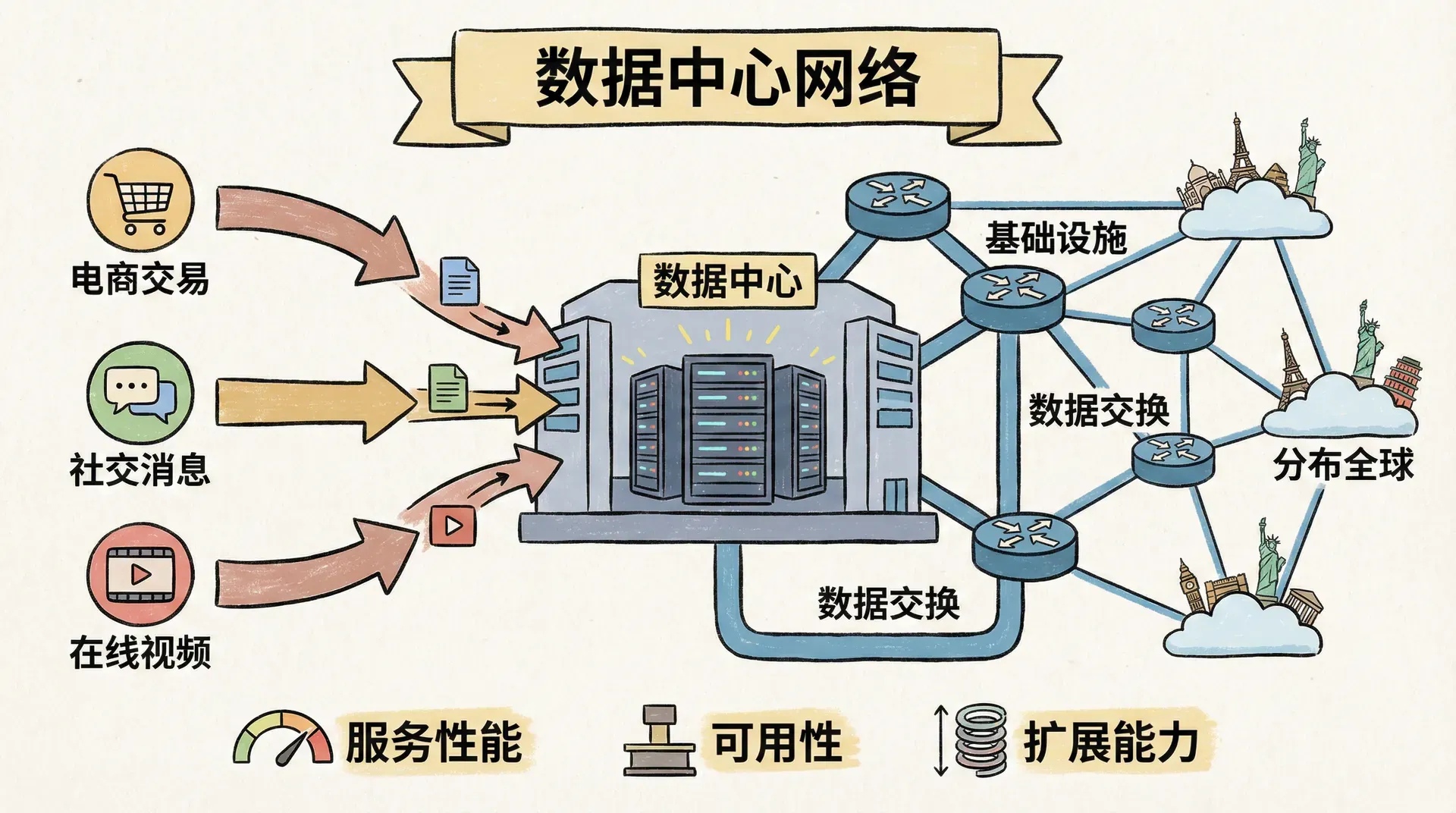 在现代互联网架构中,数据中心承担着海量数据处理与存储的核心任务。 无论是电商平台的交易请求、社交应用的消息传递,还是在线视频的内容分发,这些业务流量最终都汇聚到分布于全球的数据中心。 数据中心网络作为承载服务器集群互联与数据交换的基础设施,其设计直接影响着服务的性能、可用性与扩展能力。