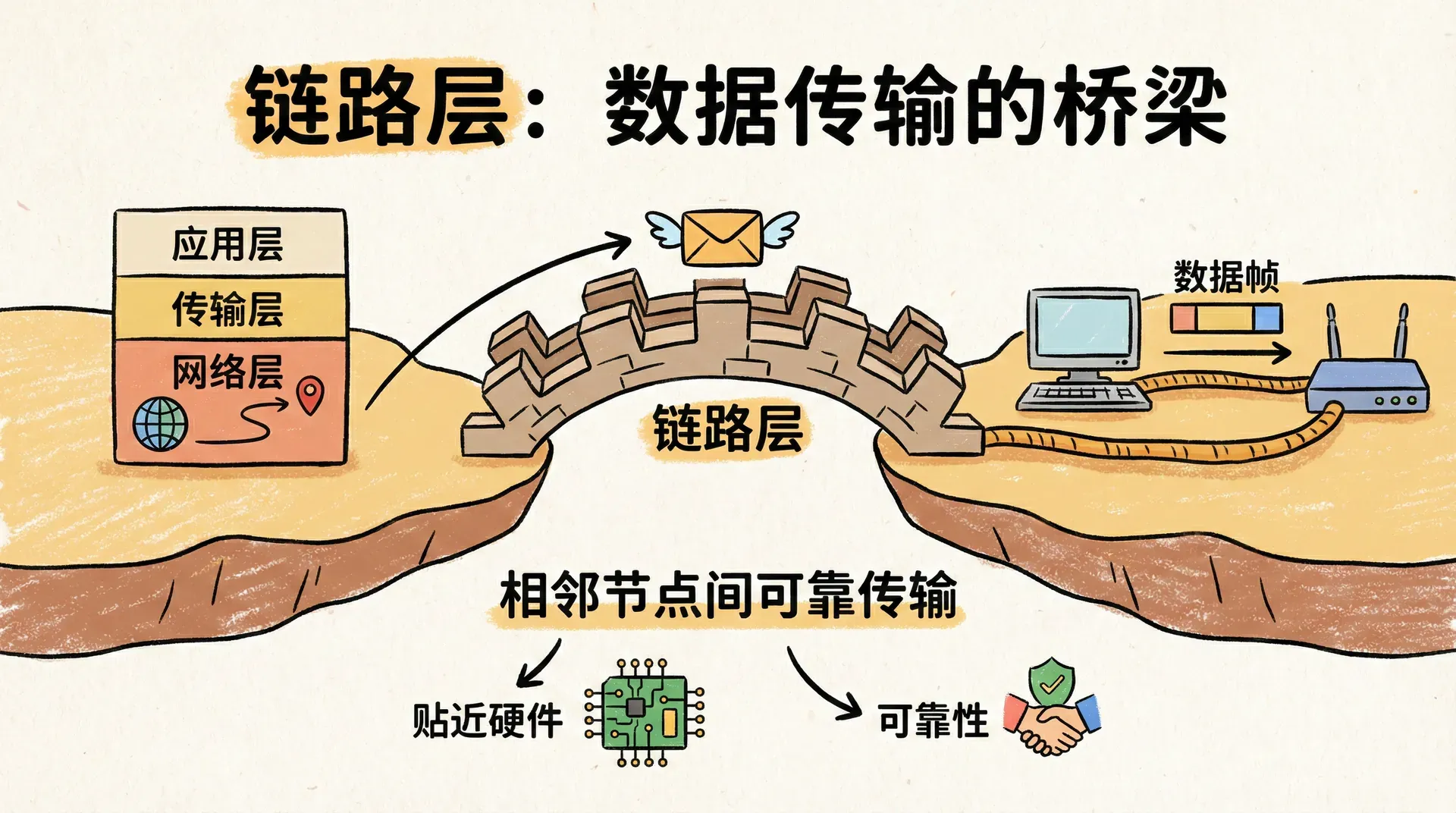 链路层就像是邮政系统中的邮递员,负责把邮件从一个邮局送到下一个邮局。它不需要关心最终目的地在哪里(那是网络层的事情),只需要专注地完成当前这一段路径的数据传输任务。