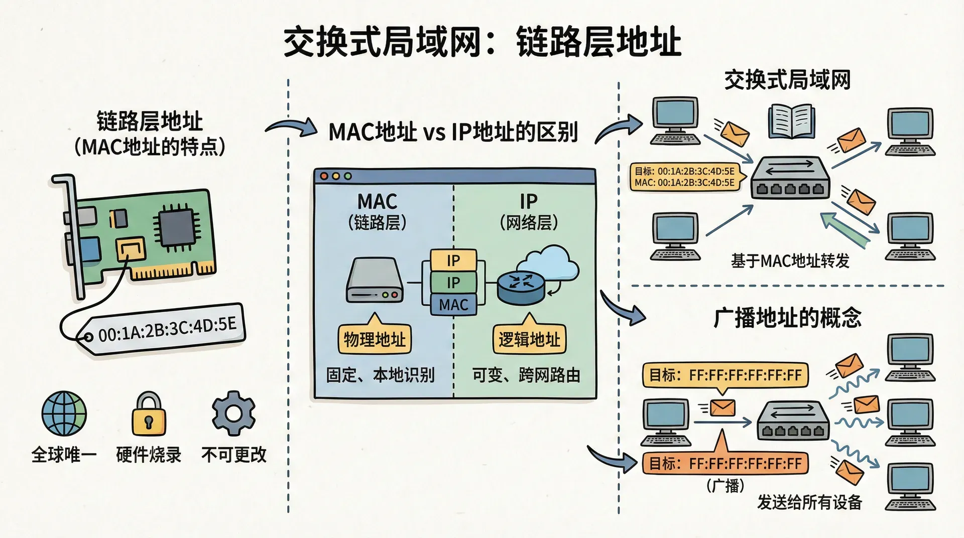 在正式探讨交换技术的细节之前,我们有必要先明晰链路层地址的专业内涵。链路层地址,亦称为物理地址或MAC地址,是分配给每一个网络接口的全球唯一标识符。 正如每位公民拥有独一无二的身份证号码,链路层地址确保了网络中每个设备接口的唯一性与可识别性,是数据链路层通信的基础。
