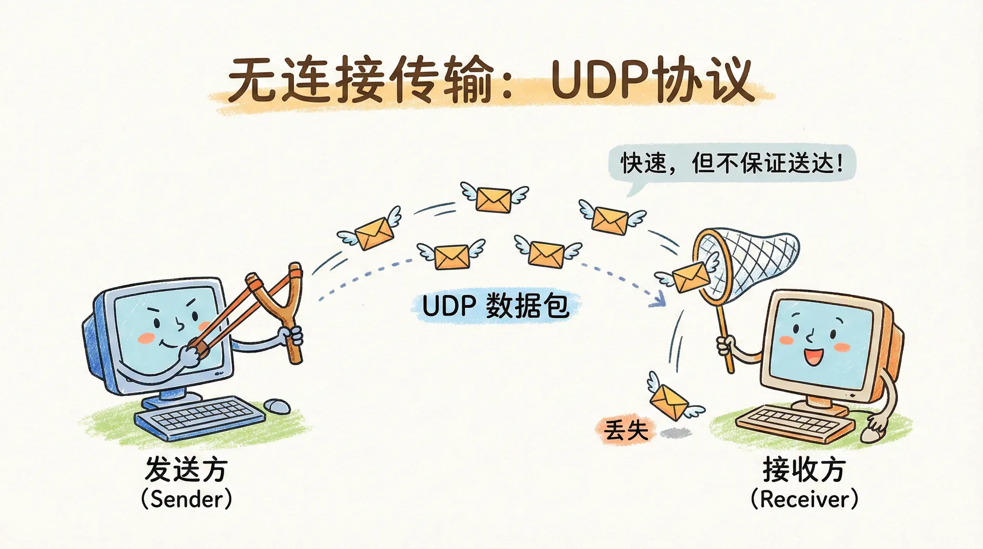 需要注意的是,UDP本身不具备拥塞控制机制。如果大量应用在没有任何速率限制的情况下通过UDP发送高比特率数据,极易导致网络路由器缓存溢出,进而引发严重的数据包丢失。 这样不仅影响UDP自身的数据传输成功率,还会对同一网络中的TCP流量造成冲击。因为TCP协议在检测到丢包后会主动降低发送速率,最终导致TCP应用的性能大幅下降。 因此,UDP应用的开发者有责任在应用层实现必要的拥塞控制策略,以维护整个网络的稳定性和公平性。