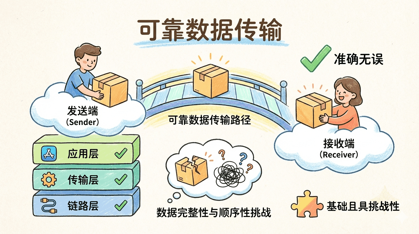 可靠数据传输的核心目标是在不可靠的底层网络之上,为上层应用提供一个可靠的数据传输通道。这个抽象使得应用开发者无需关心底层的网络复杂性。