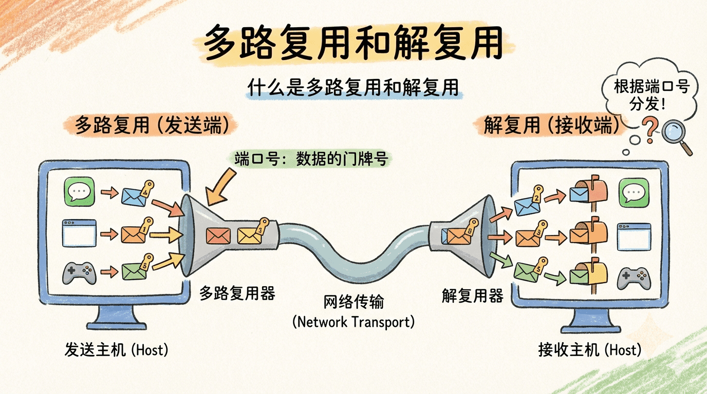 在网络世界里,一台主机经常会同时运行多个应用,比如我们一边用浏览器看网页(网页服务),一边用QQ或微信聊天(即时通讯),还可能后台在同步网盘文件(文件传输)。 这些应用都要通过网络收发数据,但数据流混在一起就会乱套。传输层的多路复用和解复用机制,就像商场里的快递分拣员,能把不同应用的数据准确分发到各自的应用,保证每个应用都能收到属于自己的信息。 这也是为什么我们可以同时上网、聊天、下载文件,这些数据🈶互不干扰的原因。