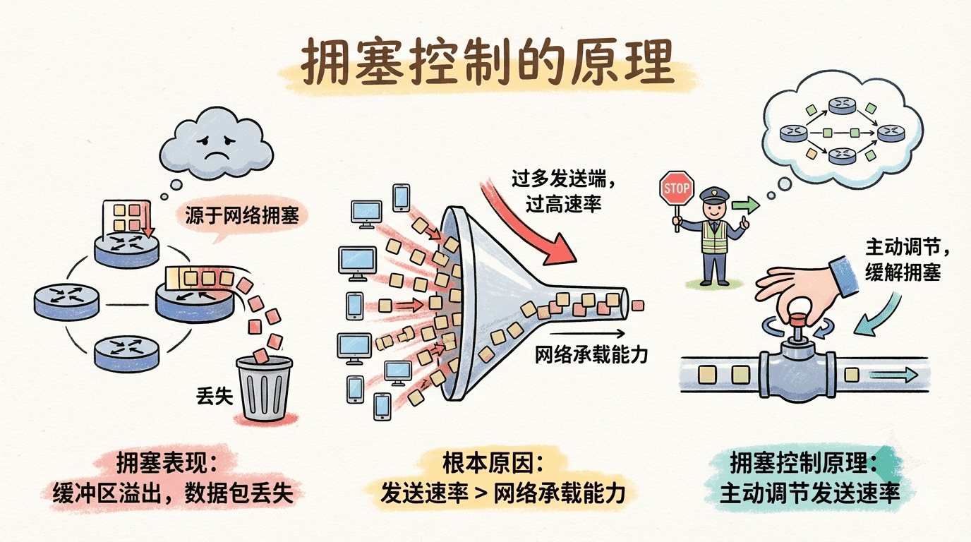 所以这个部分我们将以更为宏观和理论化的视角,系统探讨拥塞控制的基本原理。我们需要明确:网络拥塞不仅会导致数据传输延迟显著增加,还会引发丢包、重传、资源浪费等一系列连锁反应,最终严重影响上层应用的服务质量。