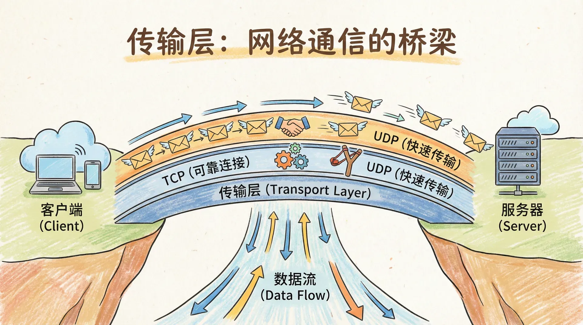 所以,网络层的任务是“主机到主机”,就像快递公司负责小区到小区的运输;而传输层的任务是“进程到进程”,就像门卫负责把包裹精确送到每个家庭成员手里。 这样一来,应用程序就不用操心包裹怎么跨越全国,只需要告诉门卫要寄给谁,剩下的交给传输层和网络层各自分工协作就行了。