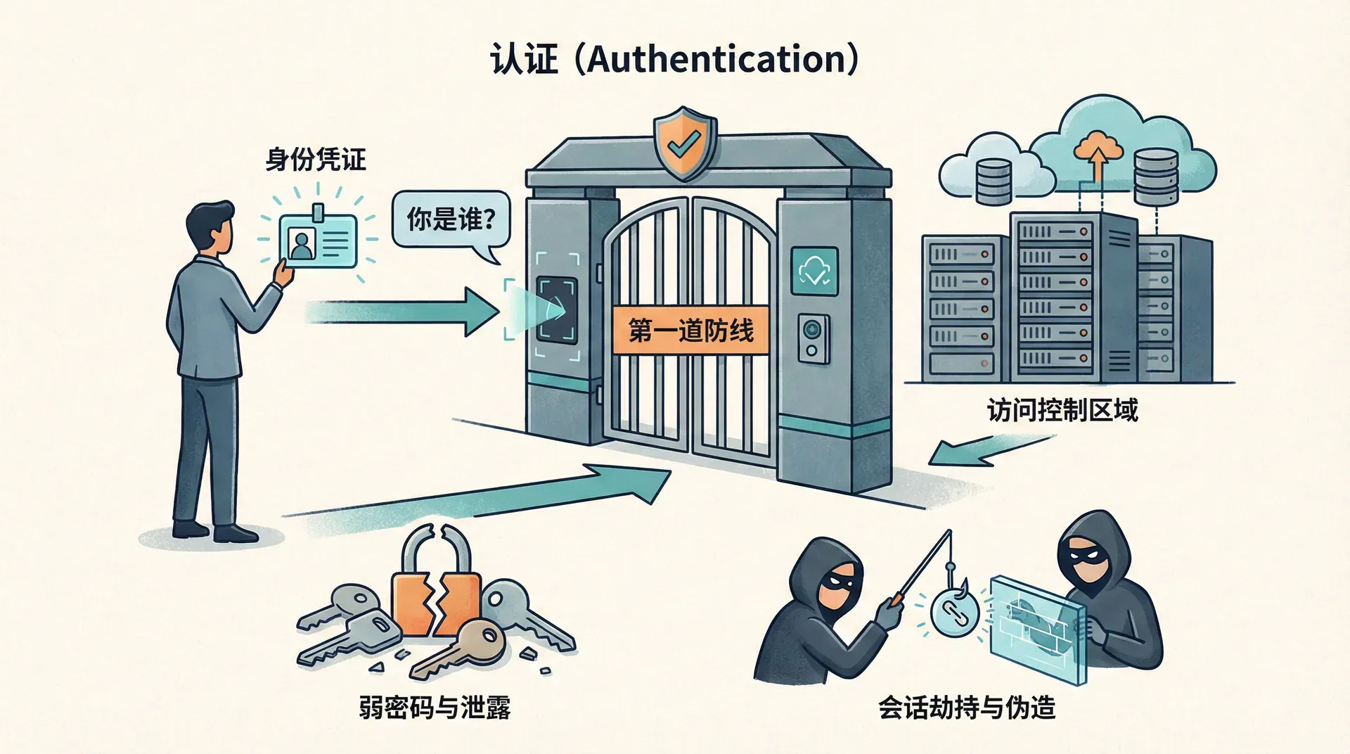 认证是安全系统的第一道防线,也是最常被攻击的环节。如果攻击者能够绕过认证,或者冒充合法用户,整个访问控制系统就会失效。历史上,许多安全漏洞都源于认证机制的缺陷:弱密码、密码泄露、会话劫持、身份伪造等。