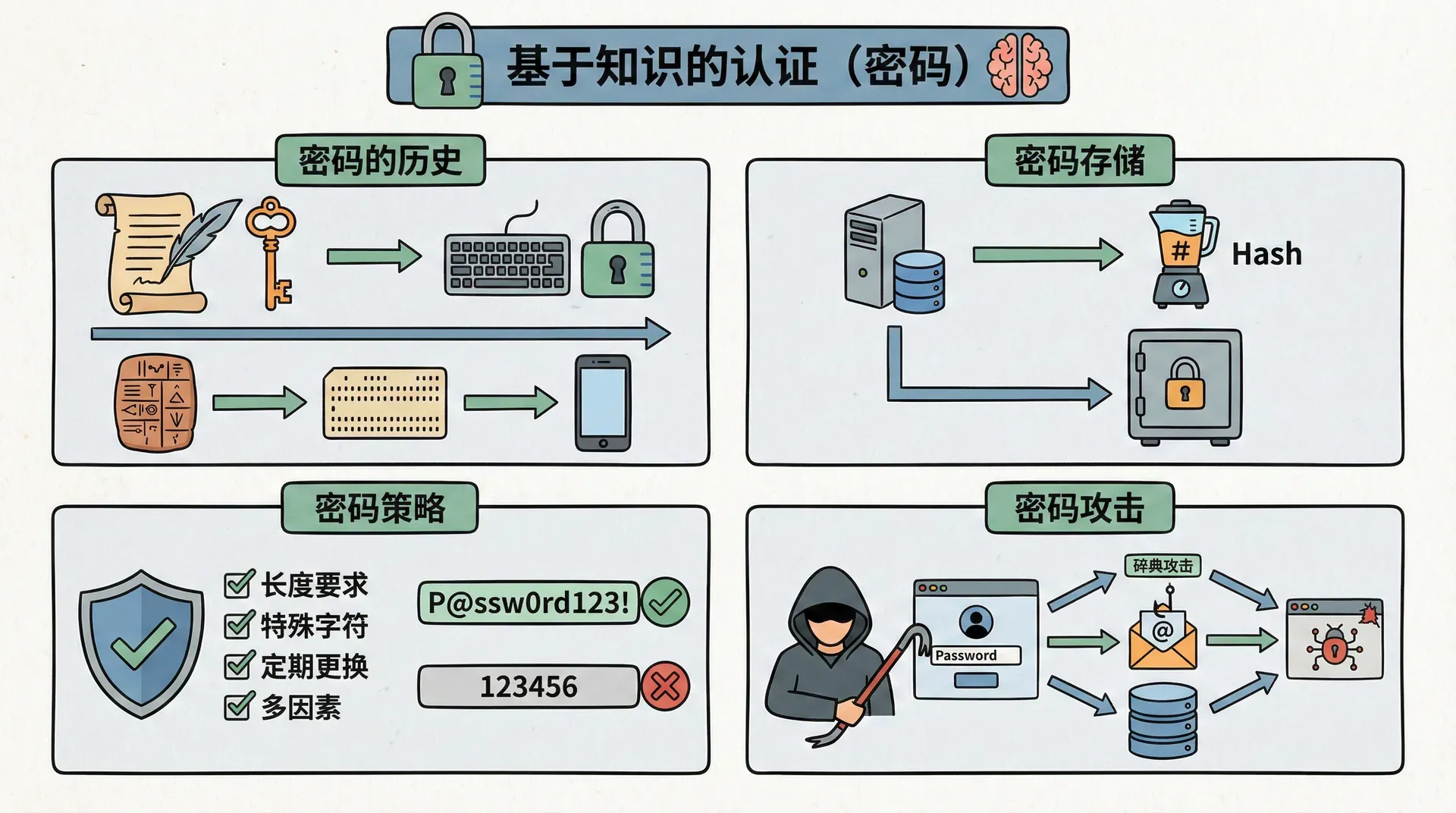基于知识的认证是最常见的认证方式。用户需要提供只有他们知道的信息来证明身份,最典型的就是密码(Password)。