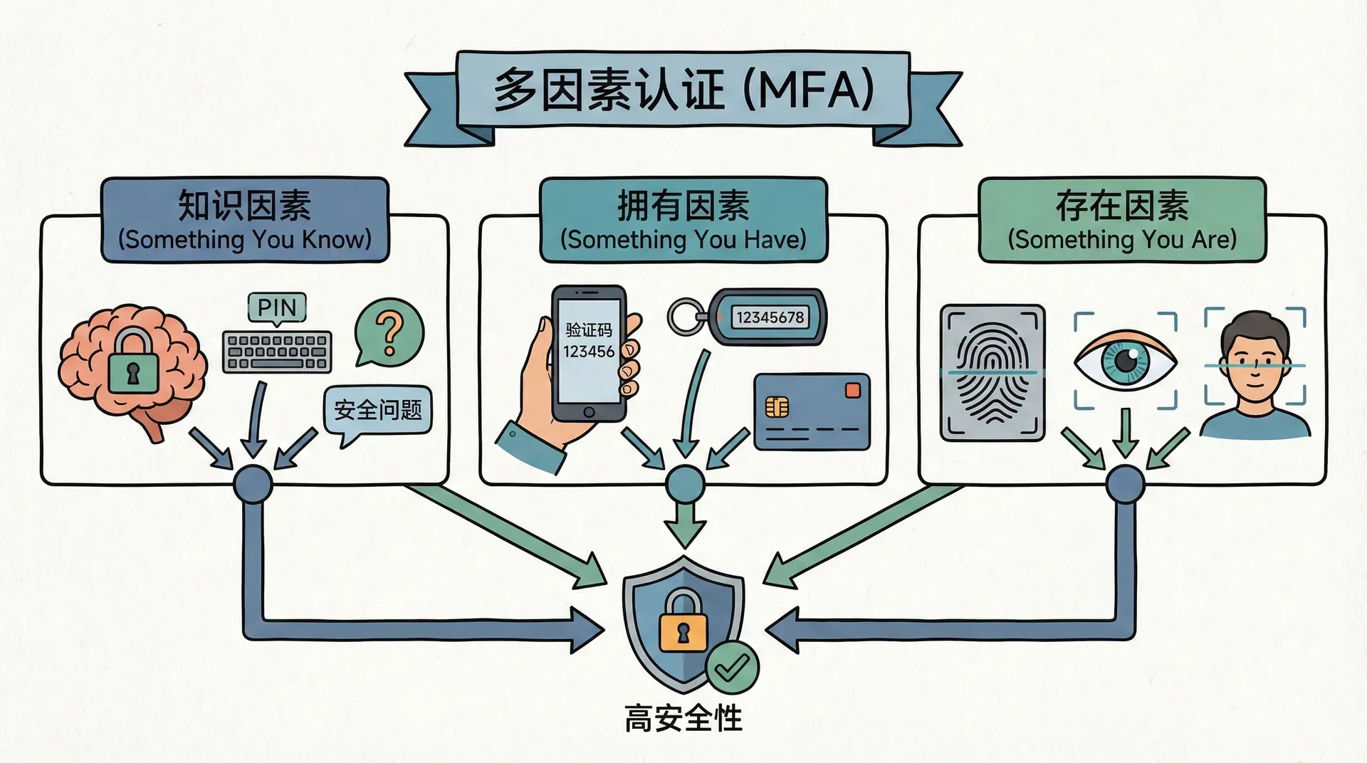 多因素认证(Multi-Factor Authentication,MFA)结合使用多个认证因素来提高安全性。即使攻击者获得了其中一个因素,他们仍然需要其他因素才能通过认证。