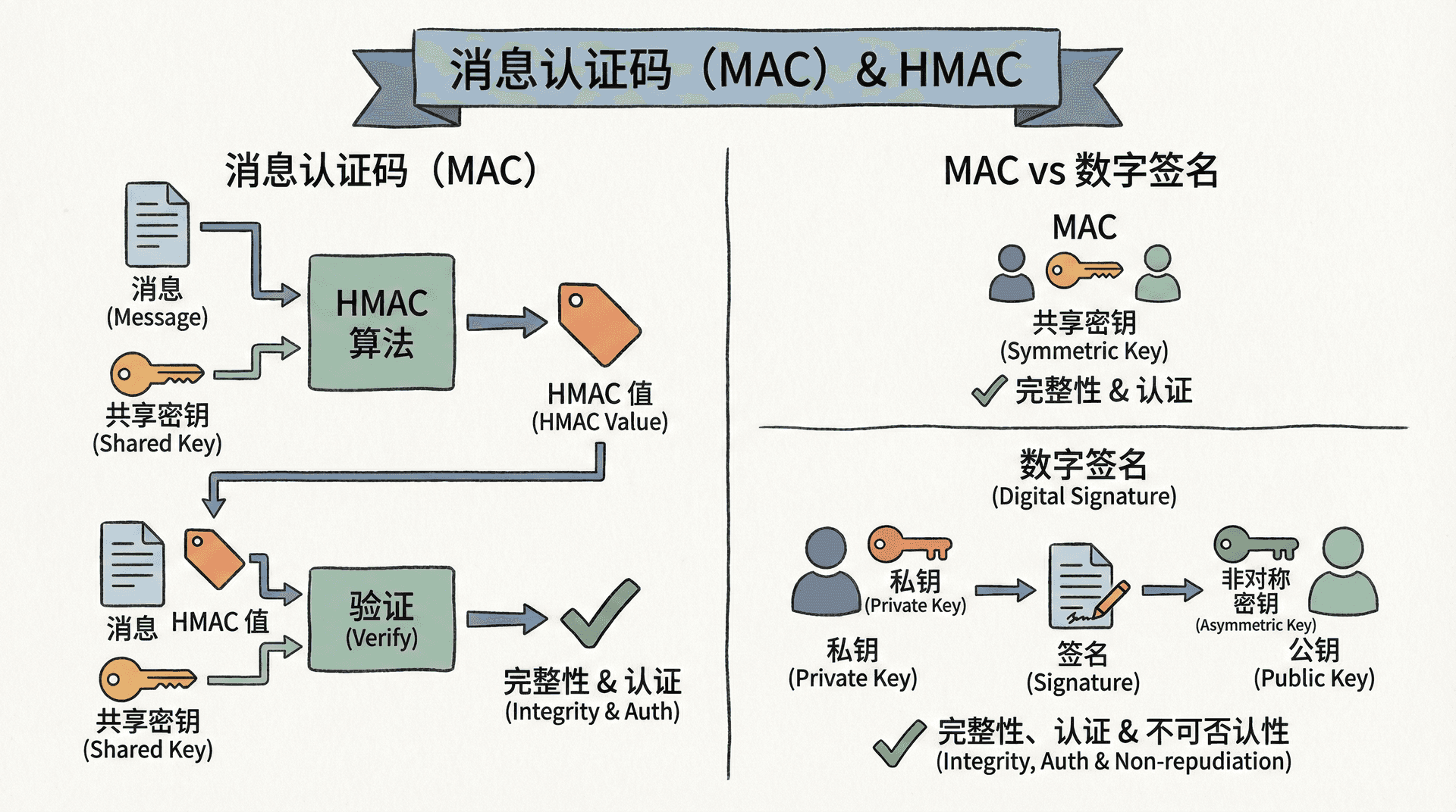 MAC和数字签名都提供消息完整性和真实性,但它们有重要区别: