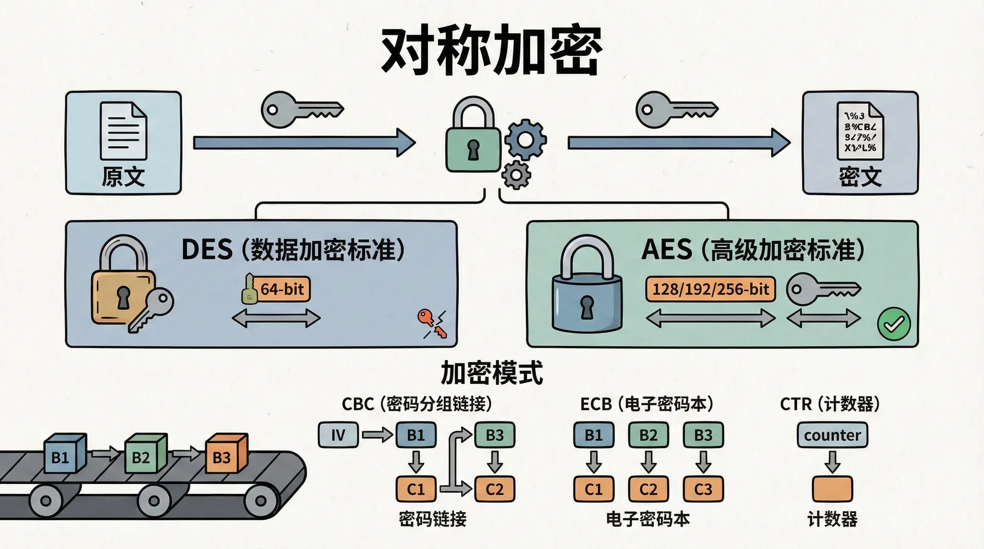AES(Advanced Encryption Standard)是现代对称加密标准,支持128位、192位和256位密钥。AES是目前最广泛使用的对称加密算法,被认为是安全的,只要正确使用。