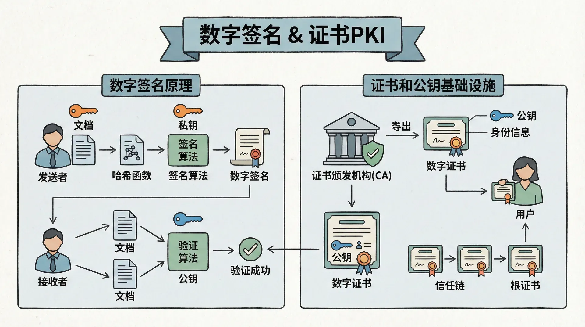 PKI使用数字证书来绑定公钥和实体身份。证书由证书颁发机构(CA)签名,CA的公钥是预先信任的。通过验证证书链,可以确认公钥的真实性。