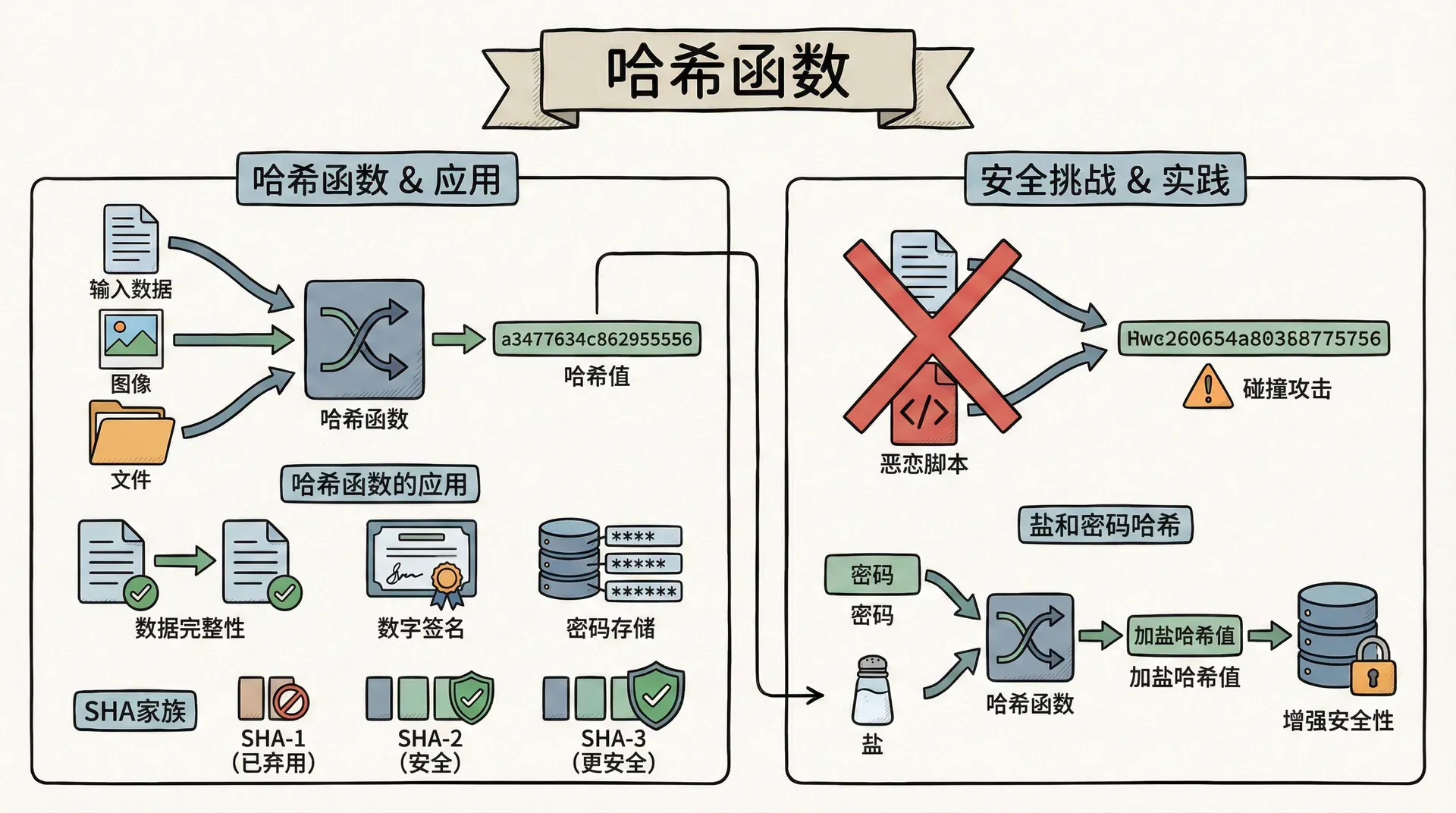 哈希函数将任意长度的数据映射到固定长度的哈希值。哈希函数应该是单向的(从哈希值无法推导原始数据)、确定性的(相同输入产生相同输出)、雪崩效应的(输入的小变化导致输出的大变化)。