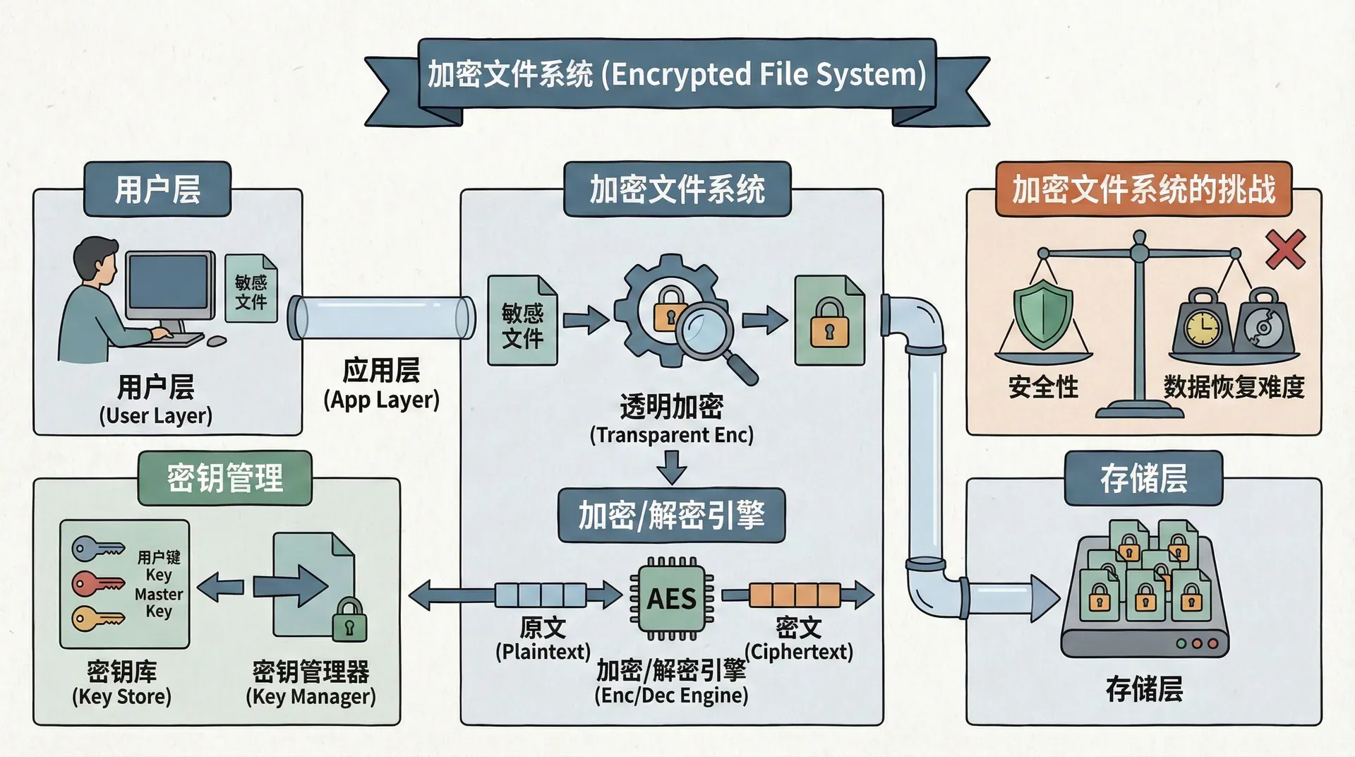 加密文件系统提供了强大的数据保护,但密钥管理是关键。如果密钥泄露,加密保护就失效了。设计加密文件系统时必须仔细考虑密钥管理。