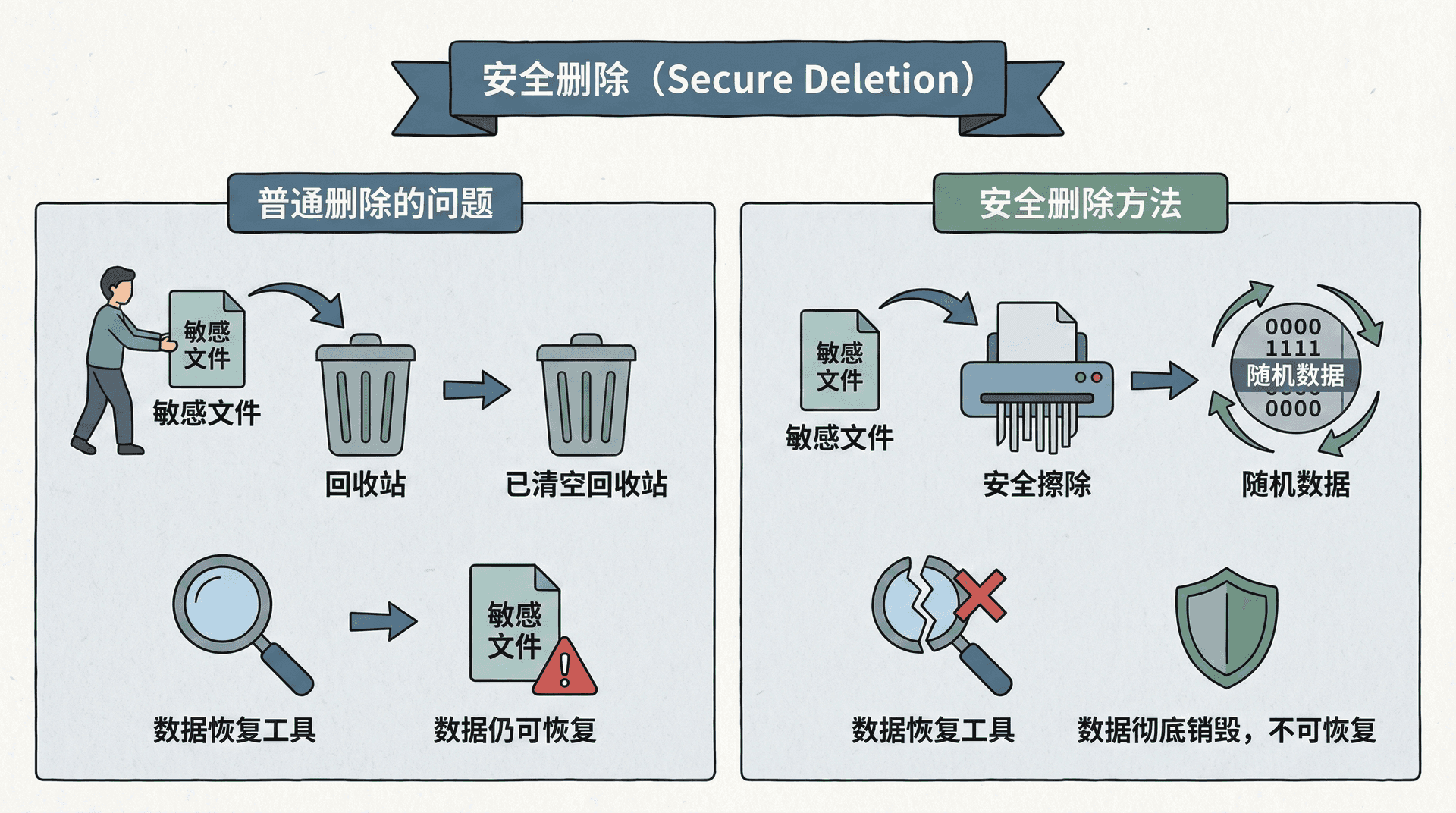 安全删除确保删除的文件无法被恢复。普通删除只是标记文件为删除,文件数据仍然存在于磁盘上,可能被恢复。安全删除覆盖文件数据,使得文件无法被恢复。
