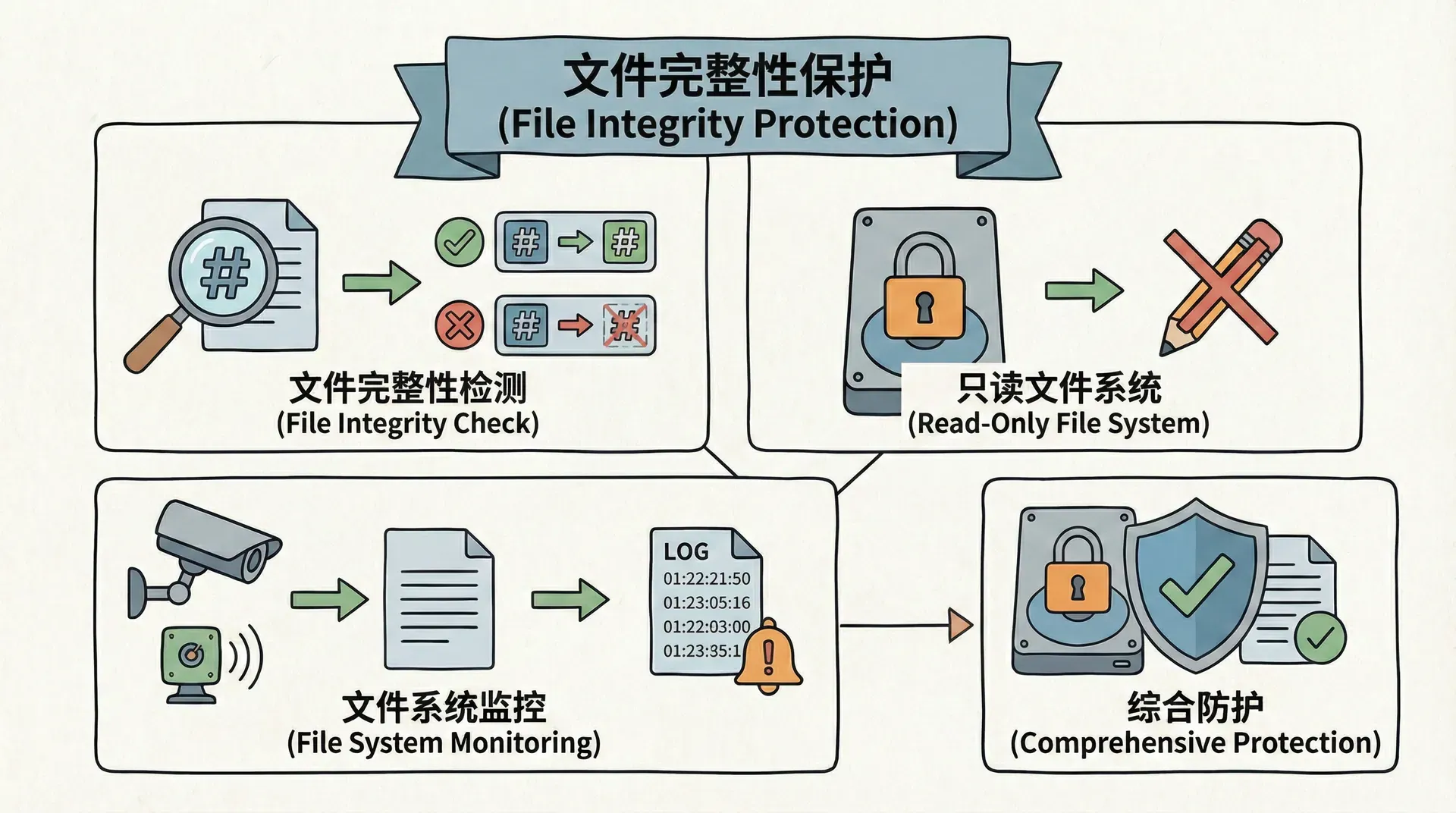 文件完整性检测可以发现文件是否被修改,但不能防止文件被修改。要防止文件被修改,需要结合访问控制、只读文件系统、写保护等机制。