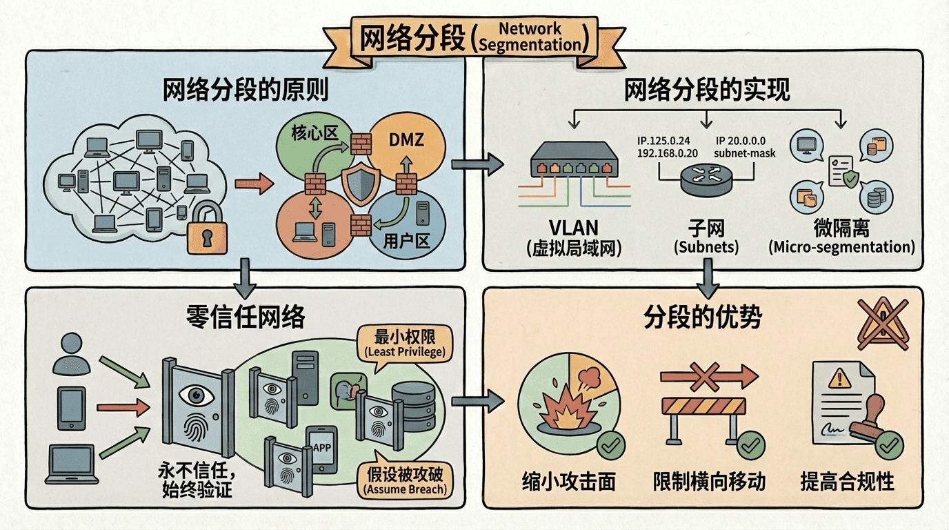 网络分段将网络划分为多个网段,不同网段之间通过防火墙或其他安全设备隔离。这限制了攻击的影响范围,即使一个网段被攻破,其他网段仍然安全。这就像是把大楼分成多个区域,每个区域都有独立的门禁,即使某个区域被攻破,其他区域仍然安全。