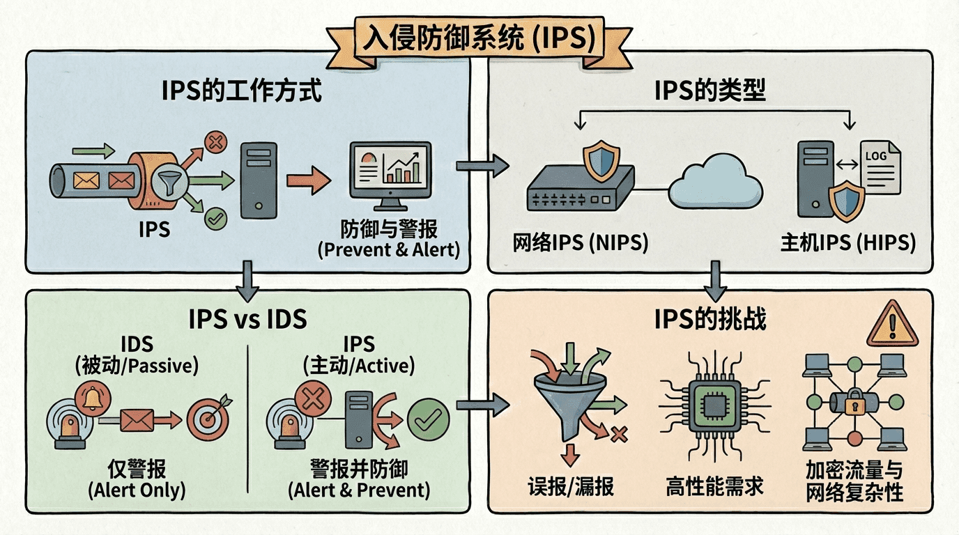 入侵防御系统(Intrusion Prevention System,IPS)不仅检测攻击,还主动阻止攻击。IPS可以看作是IDS和防火墙的结合,它既有IDS的检测能力,又有防火墙的阻止能力。