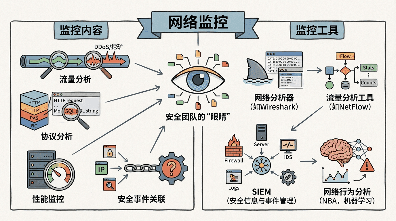 网络监控是网络安全的重要组成部分。通过监控网络流量,我们可以发现攻击、检测异常、调查安全事件。网络监控就像是安全团队的“眼睛”,让我们能够看到网络中发生的一切。