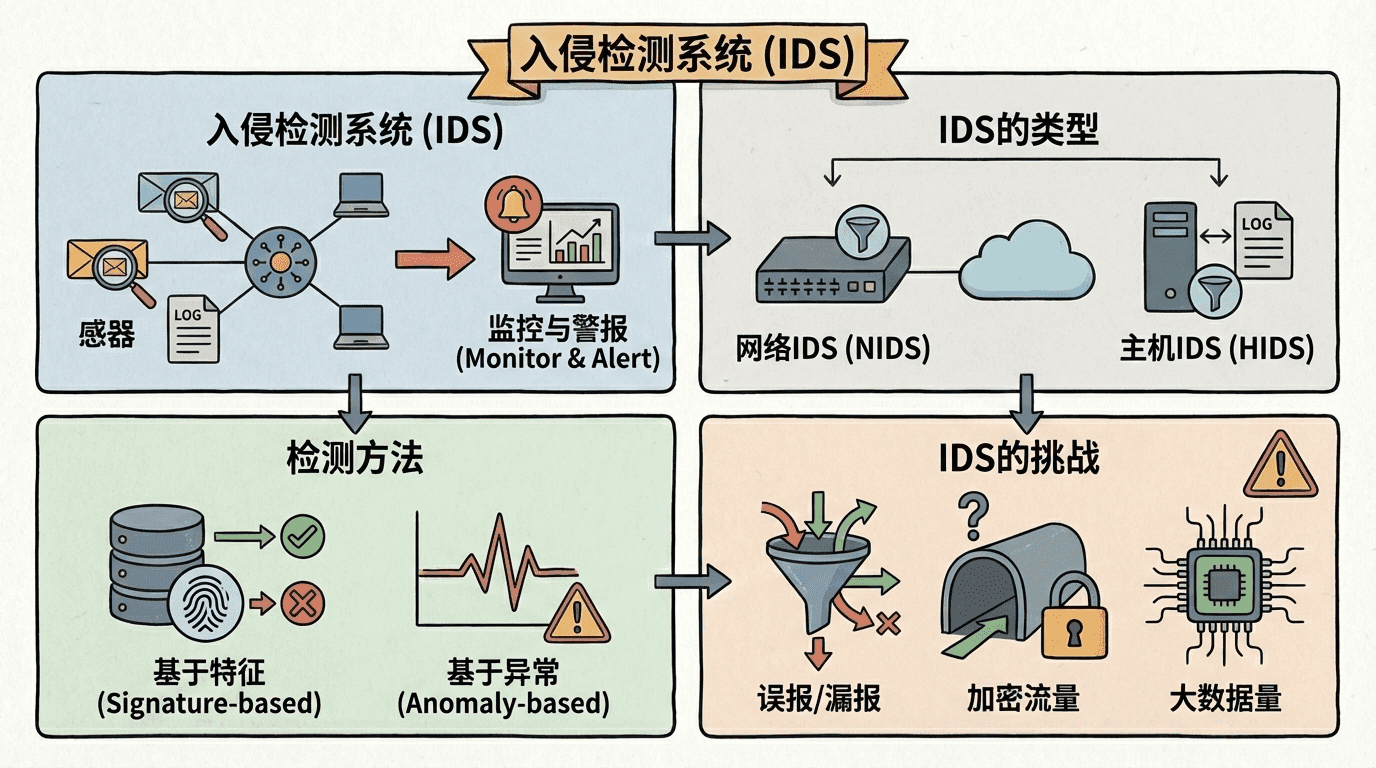 入侵检测系统(Intrusion Detection System,IDS)监控网络流量,检测可能的攻击行为。与防火墙不同,IDS不阻止攻击,只检测和报警。它就像是监控摄像头,记录下所有的活动,当发现可疑行为时发出警报。