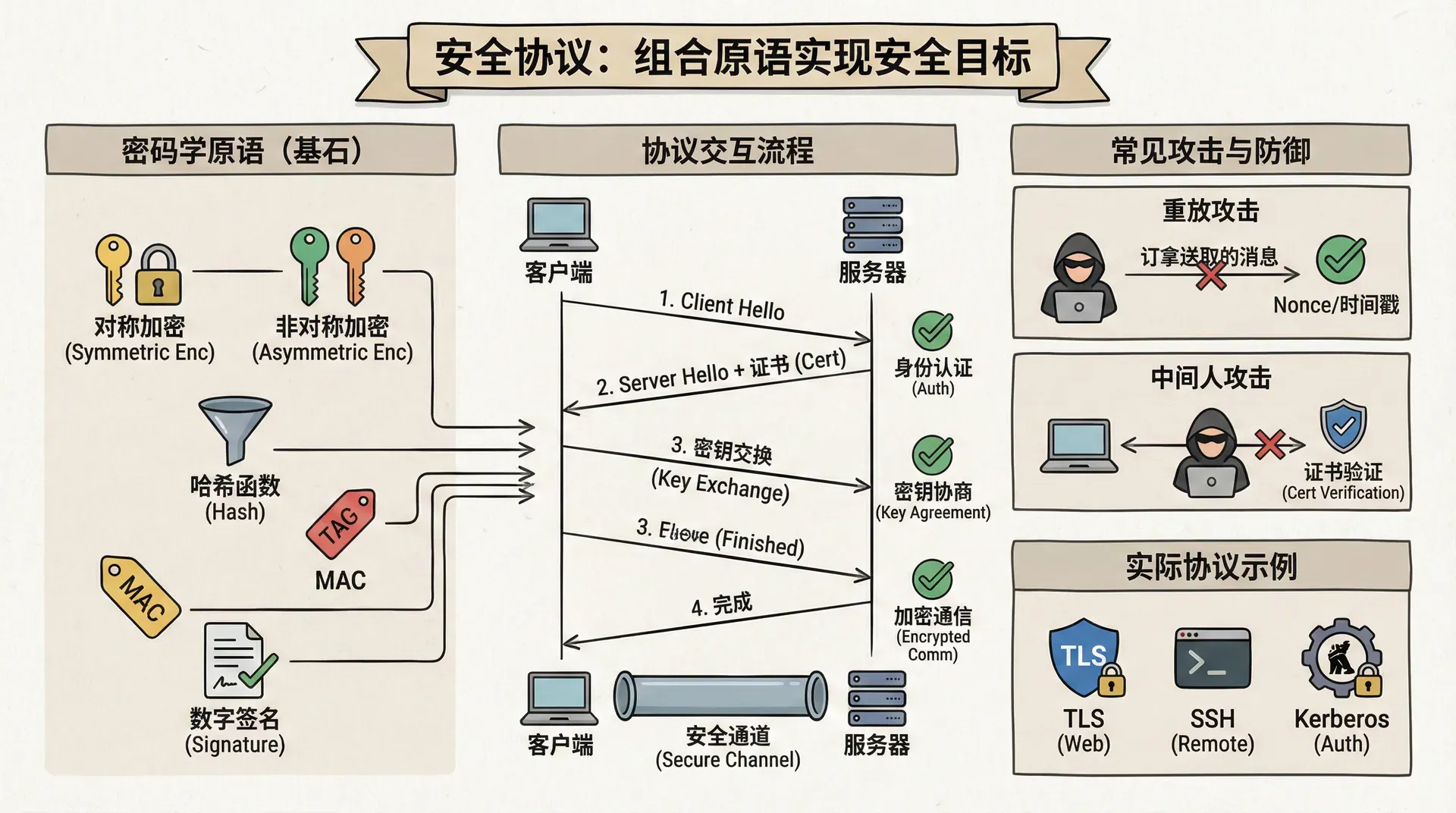 在前一节课中,我们讨论了密码学的基础:对称加密、非对称加密、哈希函数、MAC、数字签名。但这些密码学原语本身并不能直接提供安全通信。它们需要被组合成协议(Protocol)来实现实际的安全目标。