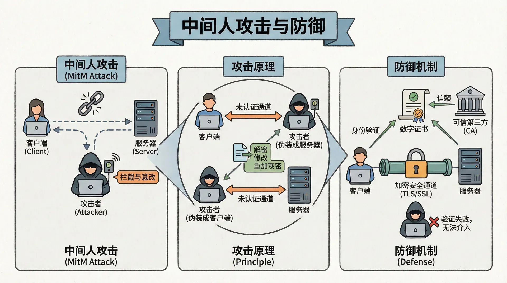 中间人攻击是网络通信中的严重威胁。即使使用加密,如果没有身份认证,攻击者仍然可以进行中间人攻击。设计协议时必须考虑身份认证。