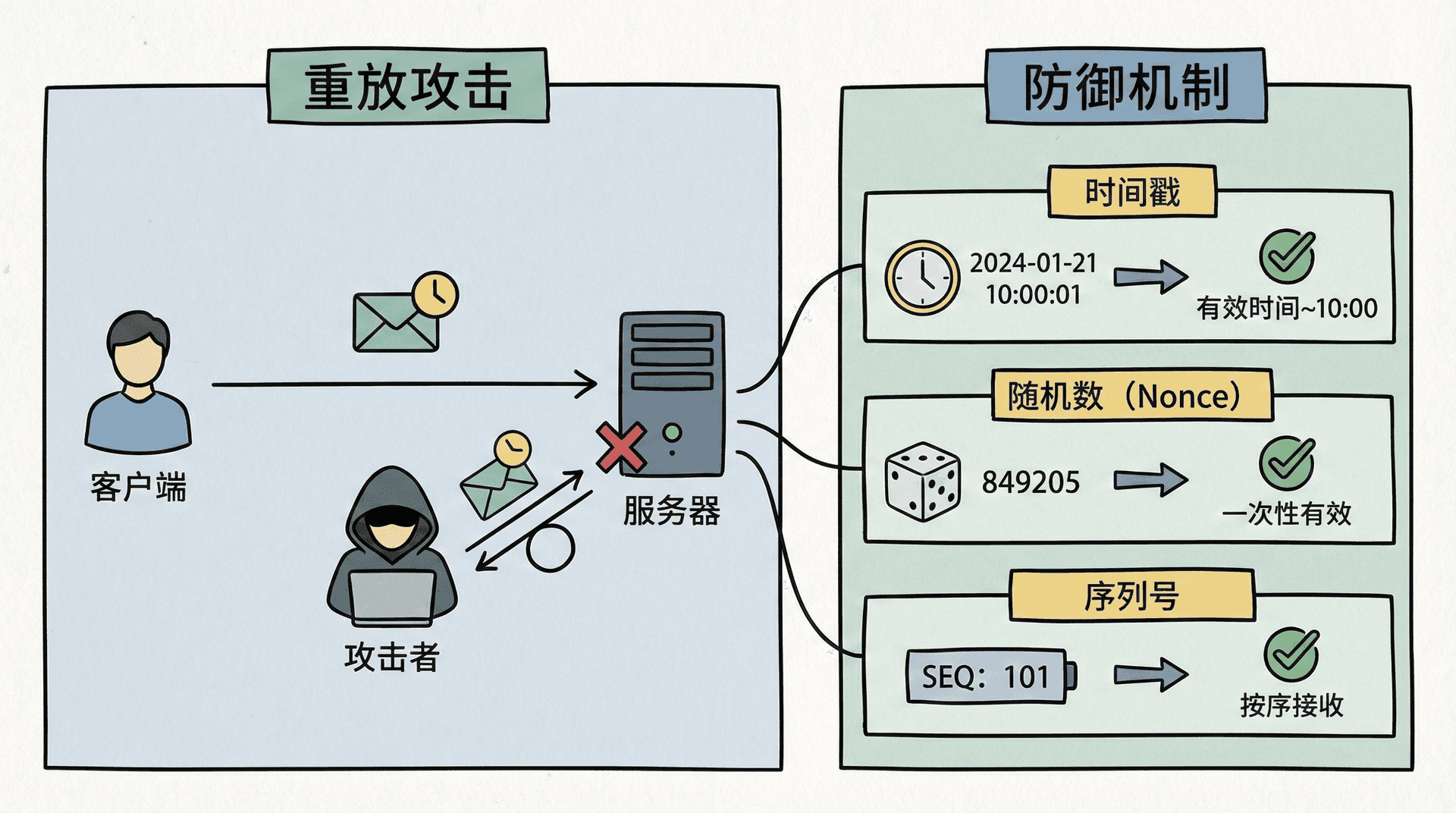 防止重放攻击是协议设计的关键要求。即使消息是加密和认证的,如果没有防止重放,攻击者仍然可以重放旧消息来欺骗系统。时间戳、随机数、序列号是常用的防重放机制。