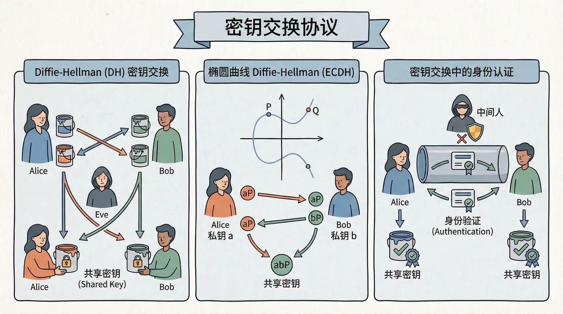 Diffie-Hellman密钥交换是最著名的密钥交换协议。它允许双方在不安全的信道上建立共享密钥,而不需要预先共享密钥。