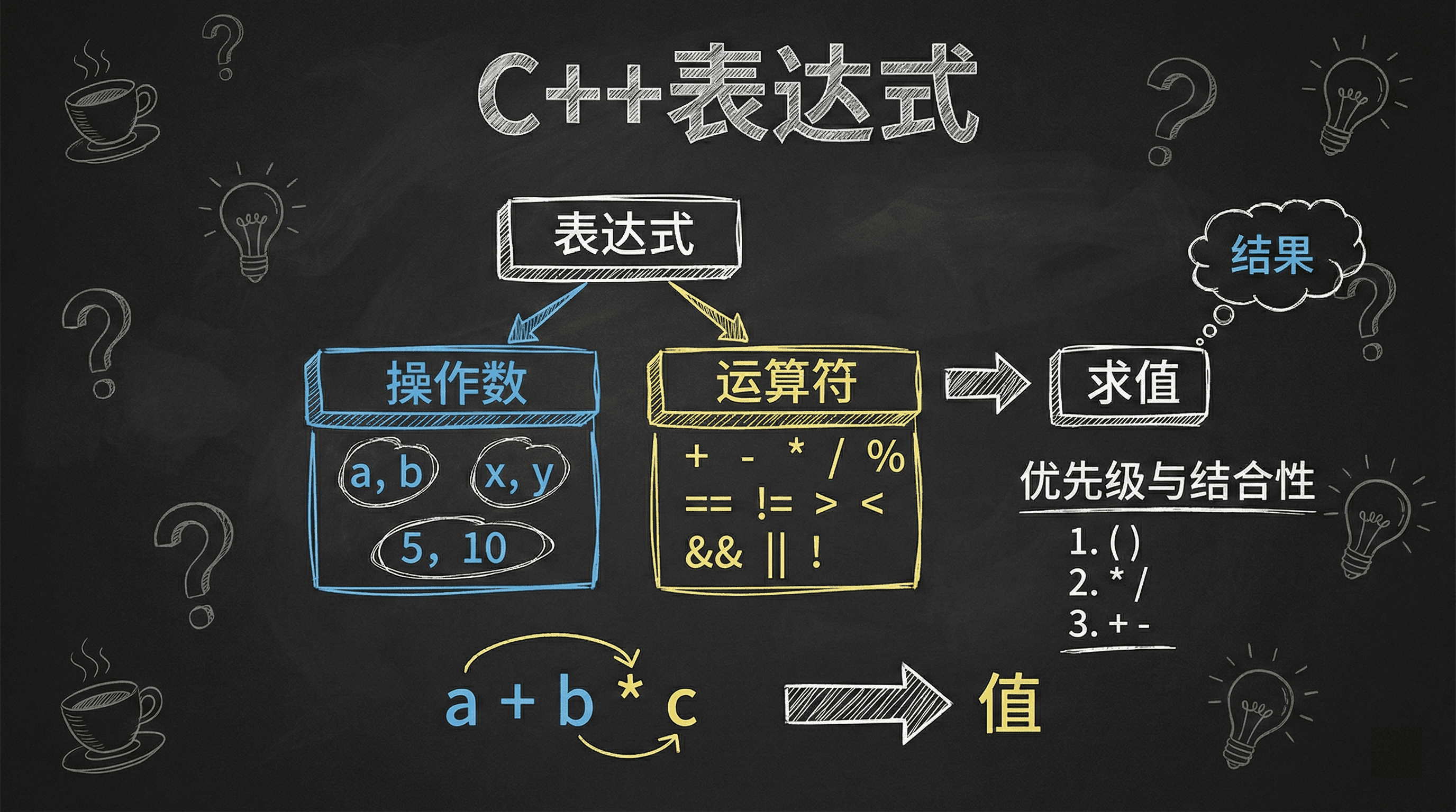 &&:先算左边,如果左边为假就不算右边||:先算左边,如果左边为真就不算右边?::先算条件,再算对应的分支,:从左到右依次计算理解表达式求值就像理解数学运算一样。运算符有不同的优先级和结合性,就像数学中的运算顺序。 类型转换就像单位换算,让不同类型的数能够一起运算。左值和右值的概念帮助我们理解变量和值的区别。 最重要的是,括号可以改变运算顺序,让我们精确控制表达式的求值过程。