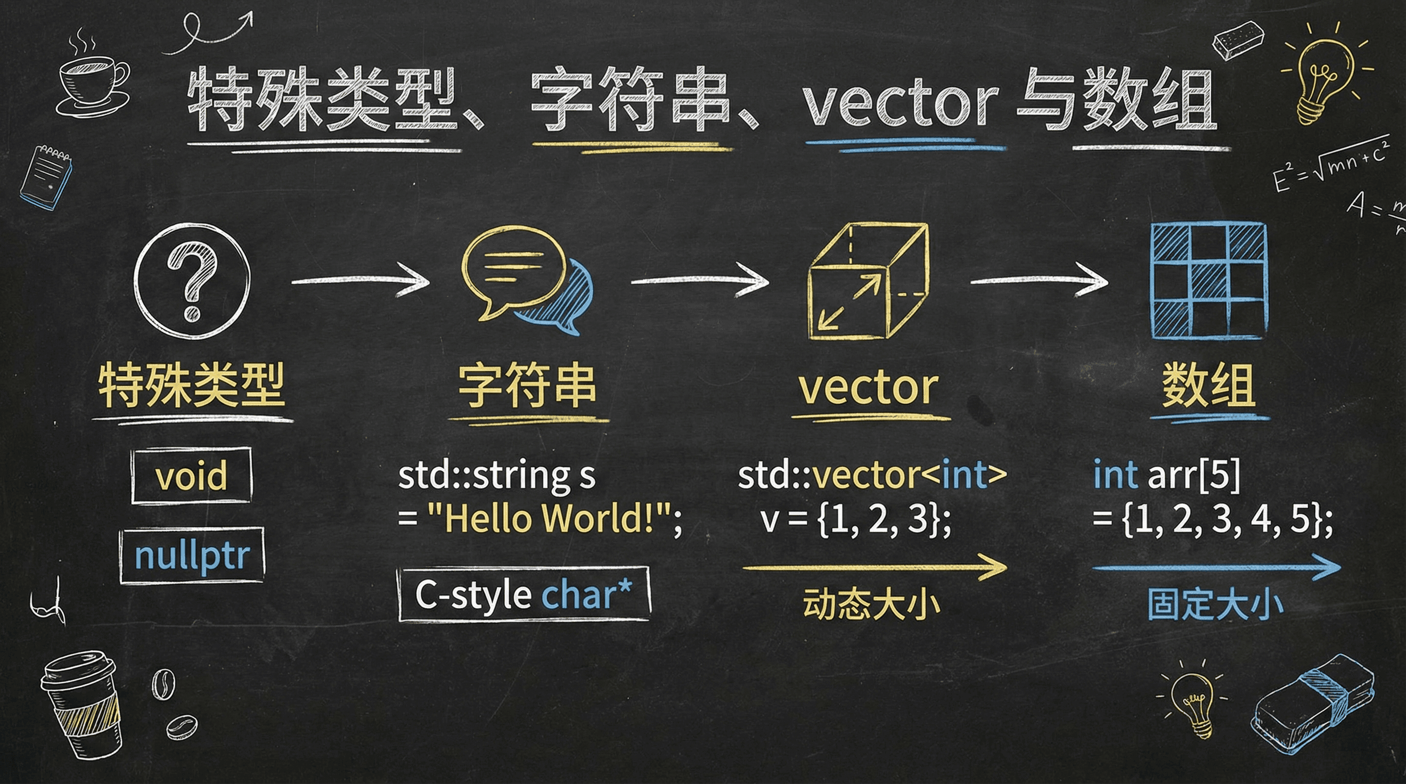 这节课我们就要系统学习这三种类型:数组(array)、字符串(string)和向量(vector)。你会发现,虽然数组是最基础的,但 string 和 vector 用起来更安全、更高效。