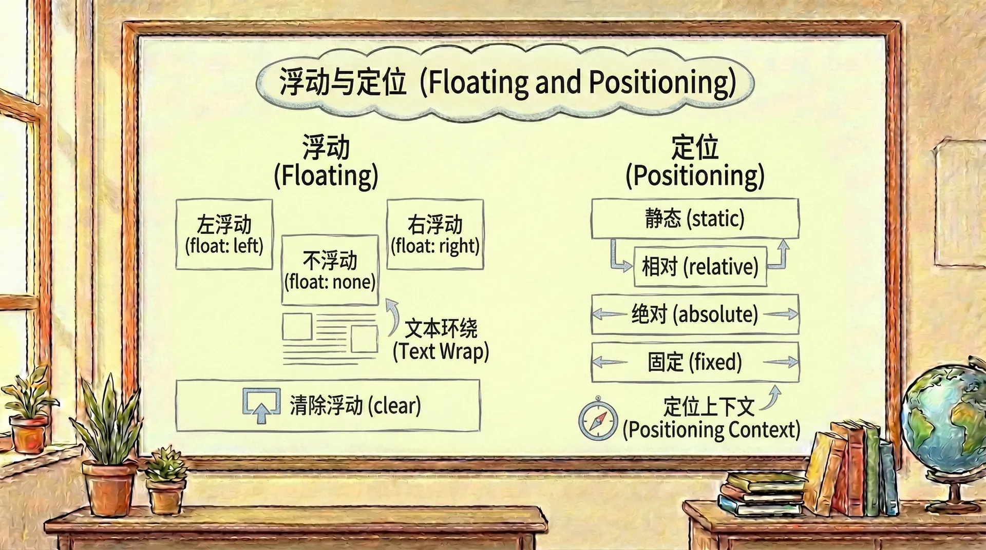 通过本部分的学习,我们掌握了CSS布局的两个重要工具:浮动和定位。浮动虽然看起来简单,但功能强大,能够让内容围绕特定元素排列,在现代CSS中仍然有其独特价值。