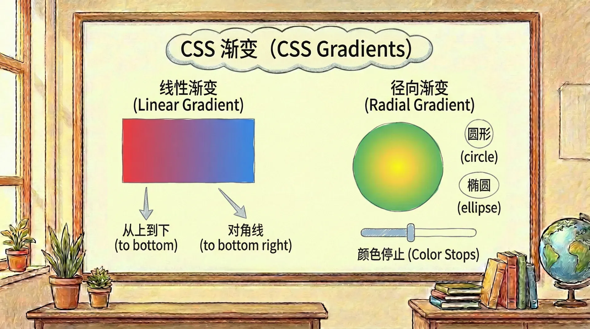 所谓渐变,其实就是两种或多种颜色之间连续过渡的视觉效果。比如从黄色过渡到红色时,色彩会从纯黄逐步渗入橙色调成分,最终过渡到鲜红。 渐变的平滑度和突变感,受可用空间大小及颜色停靠点(stops)设置的影响。例如,如果你让白色到黑色在 100px 内变化,每个像素的色彩会以极细腻的比例逐步增加深度,看起来就像灰阶平滑过渡。