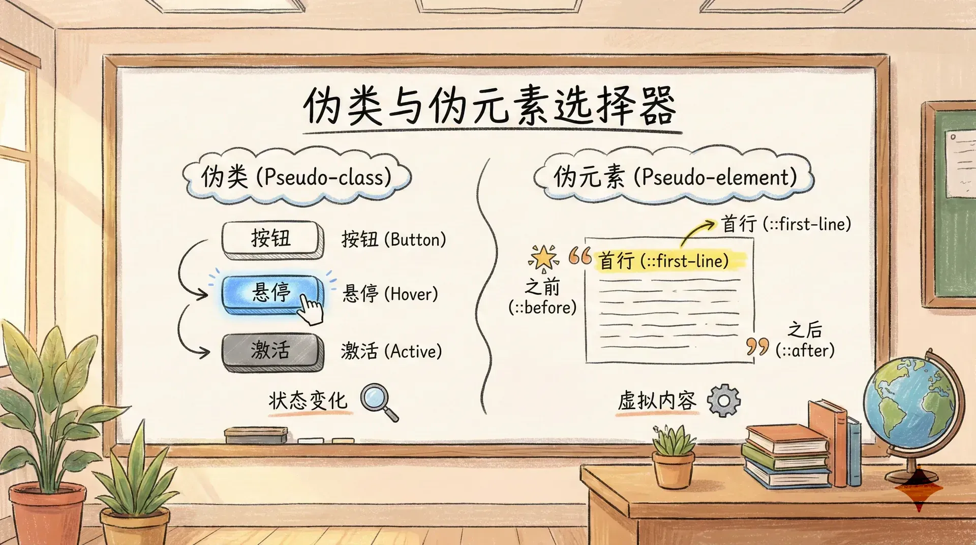 你可以把伪类选择器想象成“自动加上的标签”。这些标签不是我们在HTML里自己写的,而是浏览器根据元素当前的状态、在页面中的位置或者结构,自动帮我们贴上的。这样,CSS就能通过这些“标签”快速找到我们想要设置样式的元素了,就像浏览器帮你做了一次智能筛选。