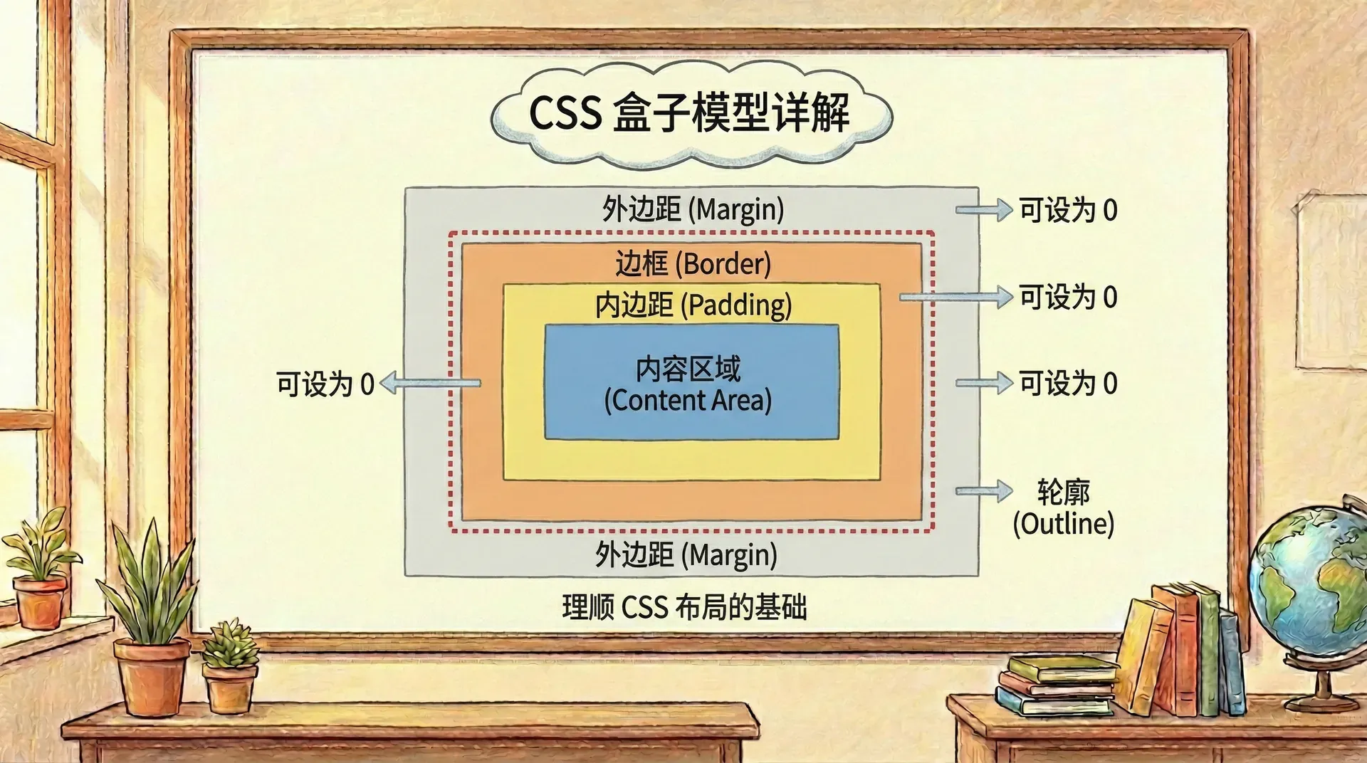 每个盒子中间是内容区域,内容外面一层一层包着:内边距(padding)、边框(border)、轮廓(outline)、外边距(margin)。这些区域其实都可以不要——只要你把它们的数值设成 0 就可以了。搞清楚它们的层次和作用,就能让你更容易理顺 CSS 布局,写起来也更顺手。