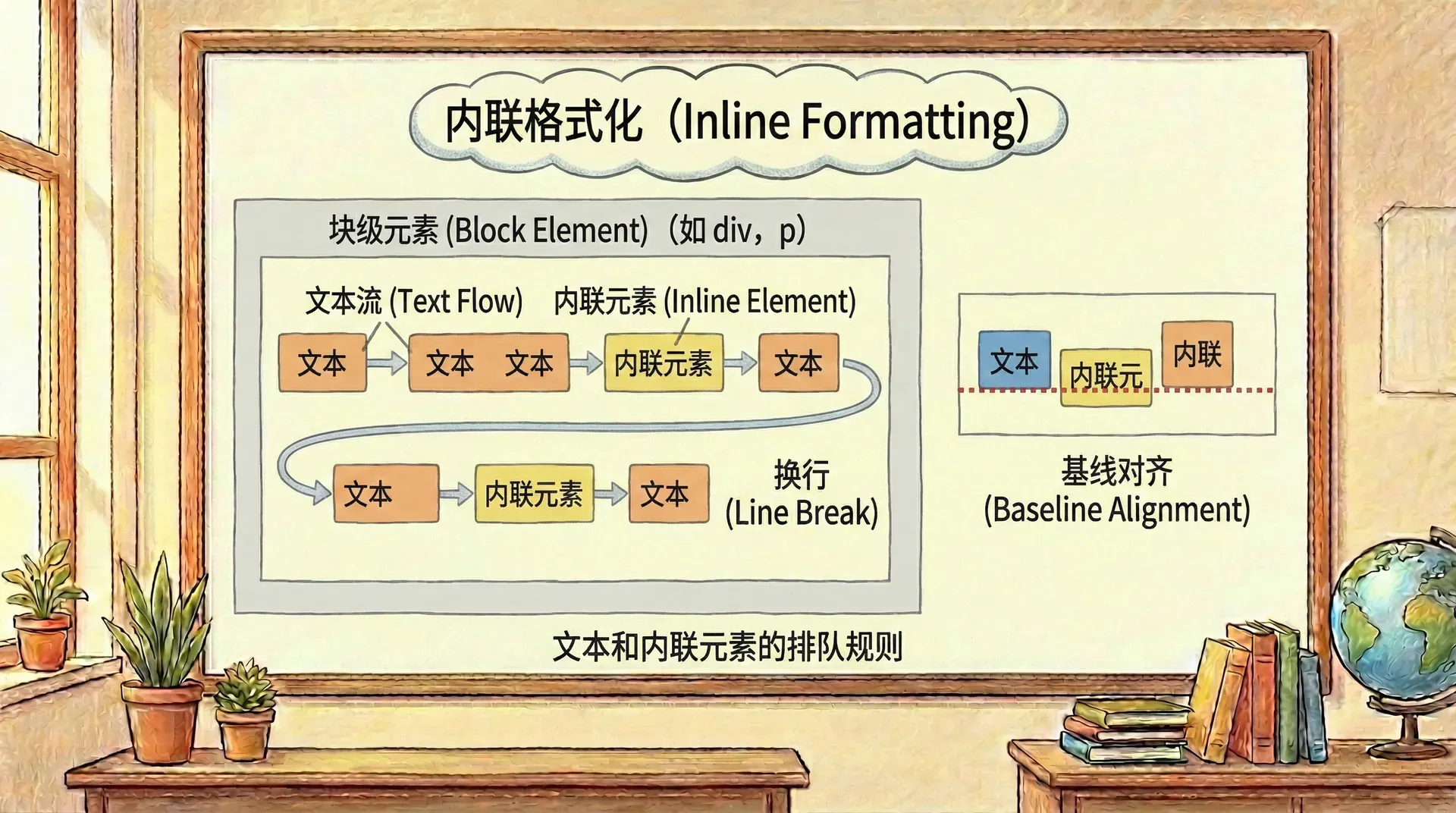 要理解内联内容如何排成一行,可以先想象有一个很长的句子放进了一个定宽的盒子里(比如一个段落)。网页会自动根据盒子的宽度,把内容分割成多行,让它们正好适应容器宽度。每当一行放不下更多内容时,就会自动换到下一行。这种把长文本分成多行的方法,实际上就是将内容拆分成可以沿着块流方向依次堆叠的片段。